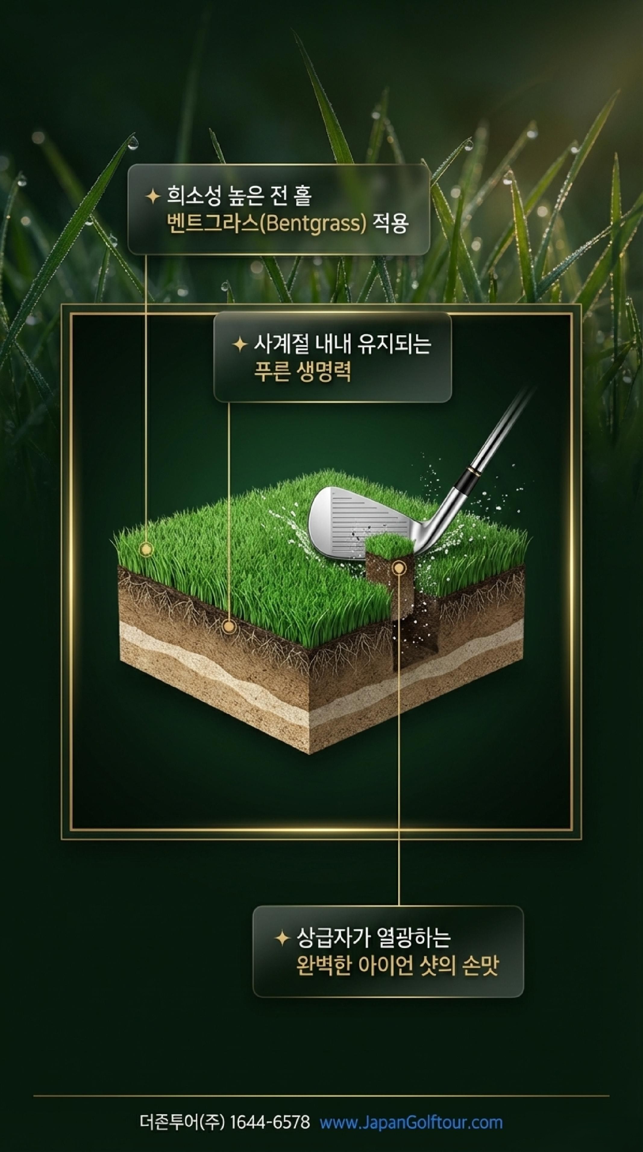 사계절 내내 푸른 빛과 일정한 밀도를 유지하는 최고급 벤트그라스는 아이언 샷 시 특유의 '뗏장(Turf)'이 깔끔하게 떨어지는 최상의 타구감을 제공한다. 이는 단순한 기분 전환을 넘어, 볼 스핀 컨트롤을 극대화하려는 VIP 고객의 기술적 요구를 완벽히 충족시킨다.