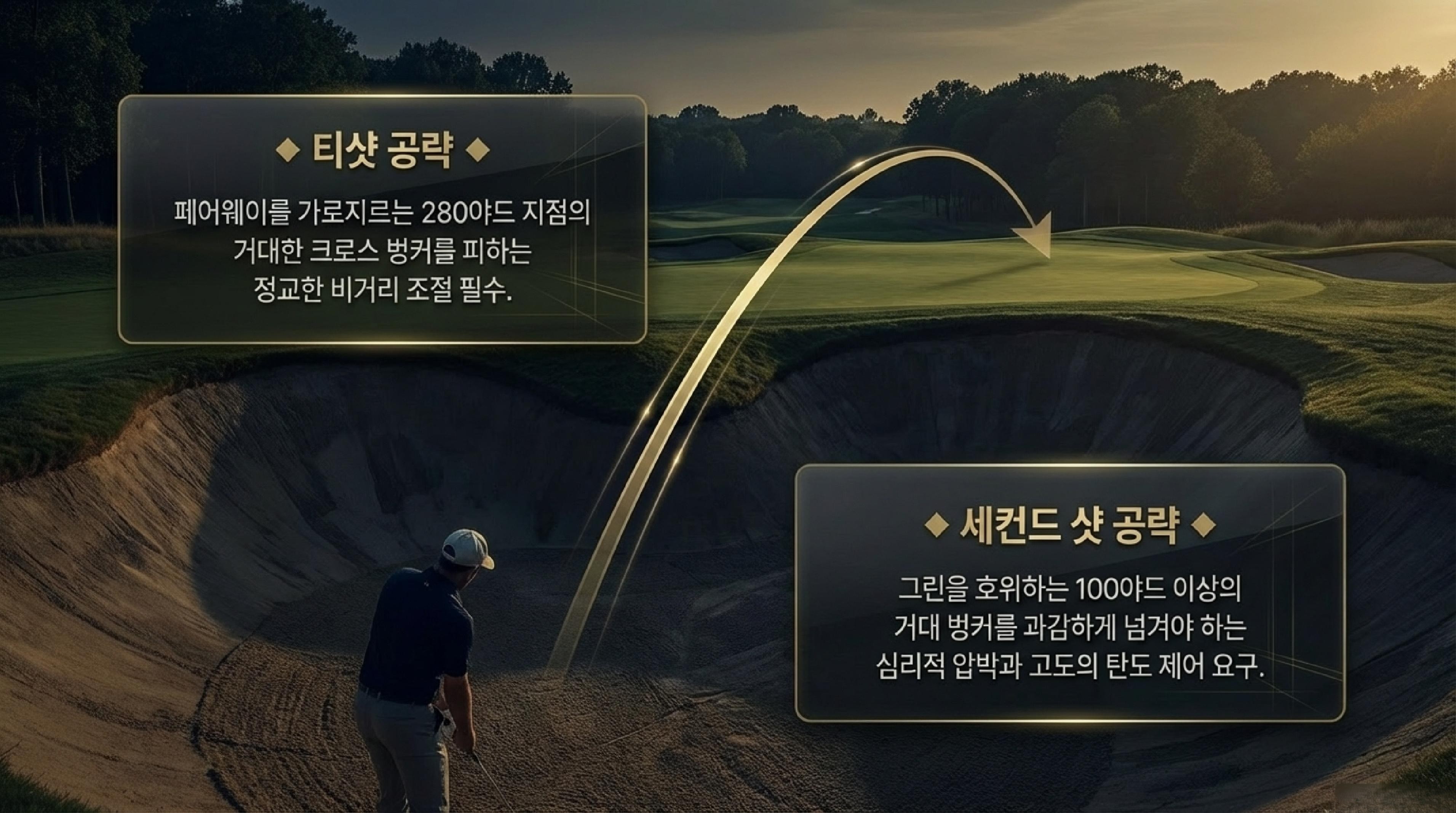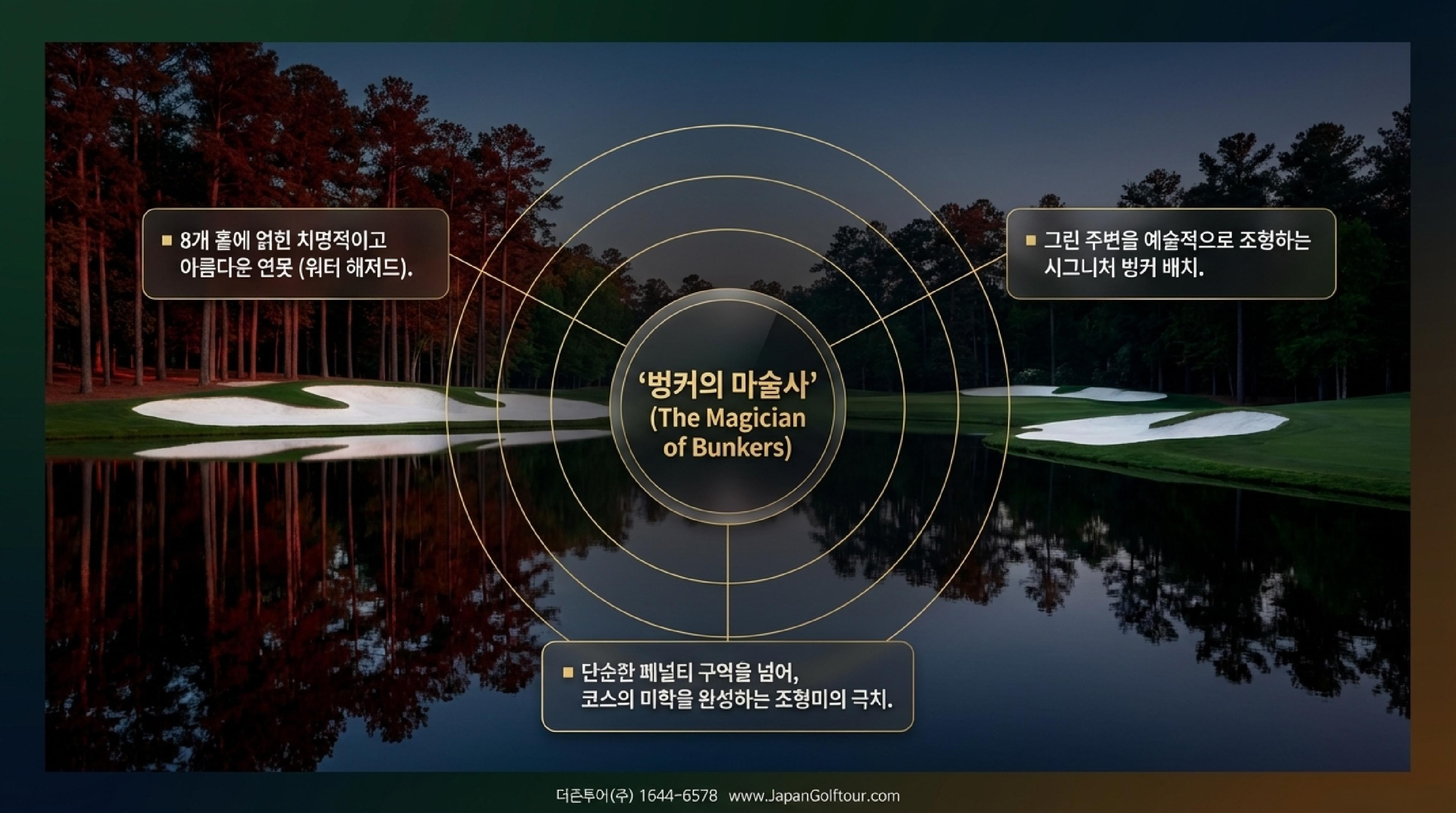 🔹 14번 홀 (Par 4): 리스크 관리의 정수. 안전한 우측 루트는 그린 시야가 제한적이며 거리 조절이 어렵다. 반면 거대한 벙커와 연못을 넘겨야 하는 좌측 루트는 성공 시 최상의 버디 기회를 제공하는 '하이 리스크-하이 리워드'의 전형이다.