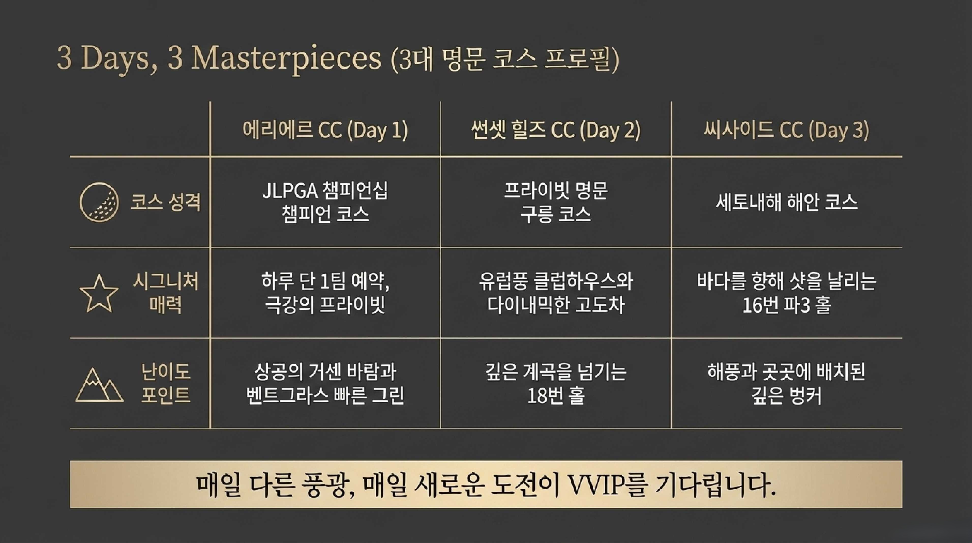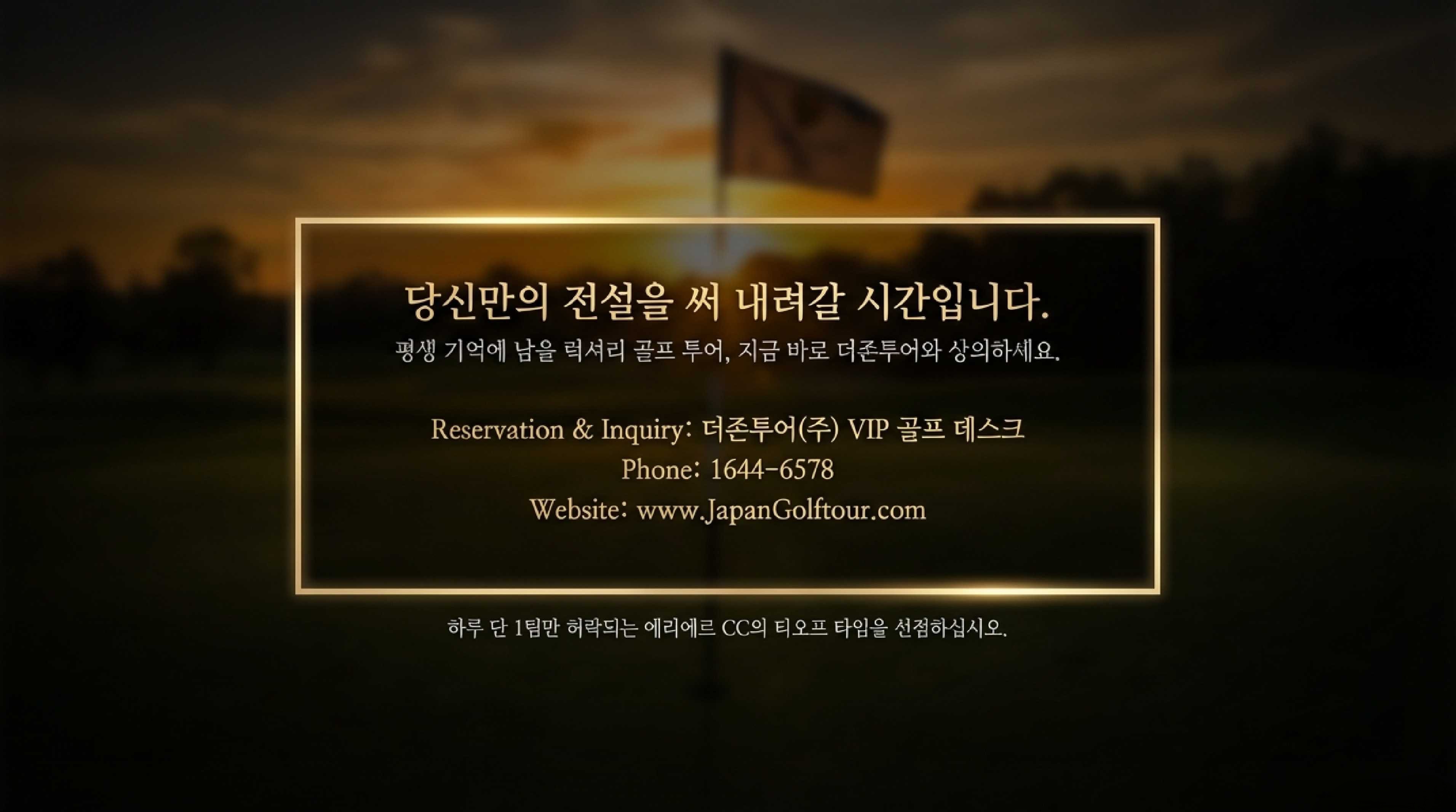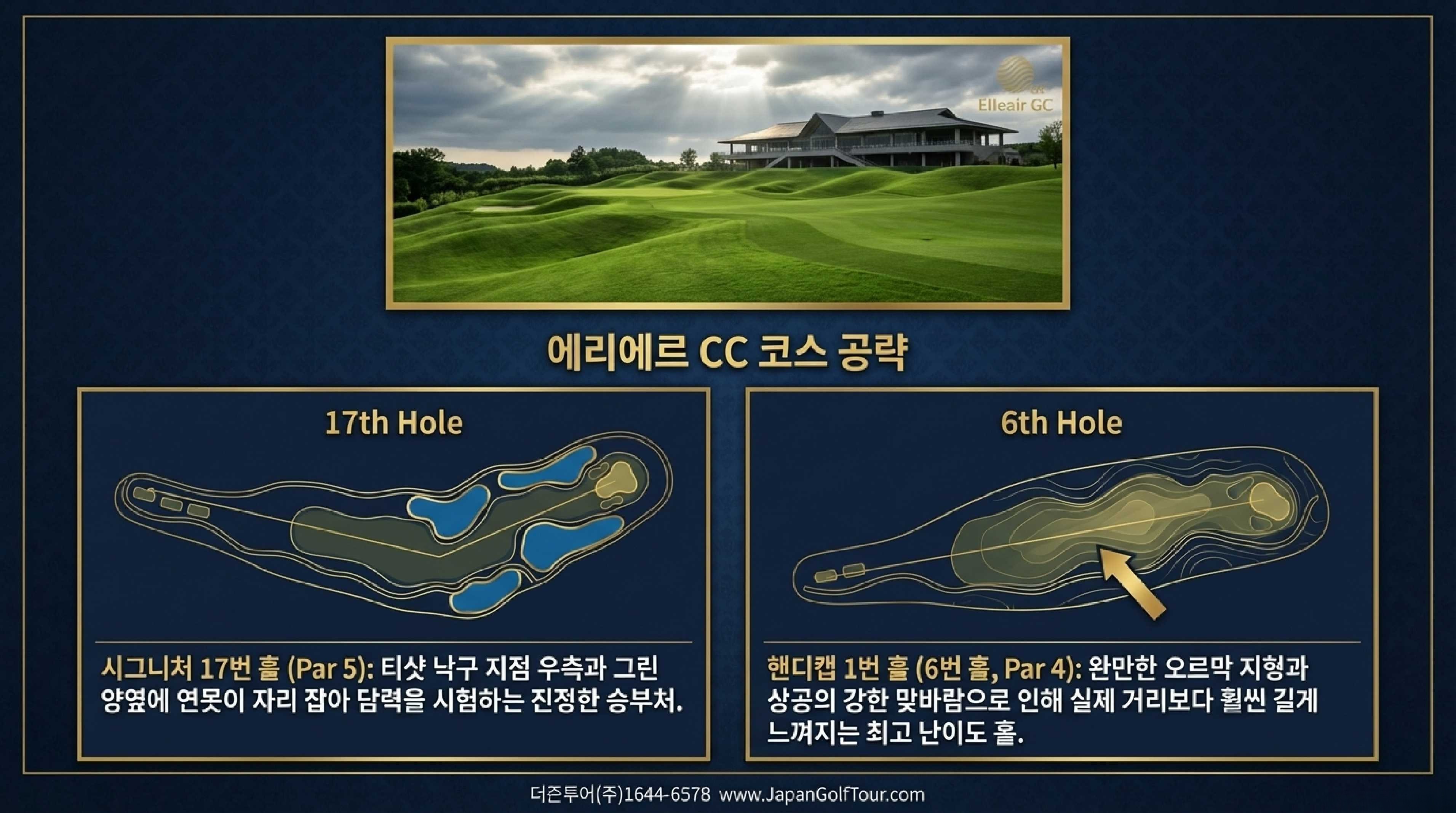 🔹 에리에르 예약: 1일 1팀 제한. 수개월 전 예약이 일반적이며 골프 전문여행사를 통해 사전 확정이 필수다.