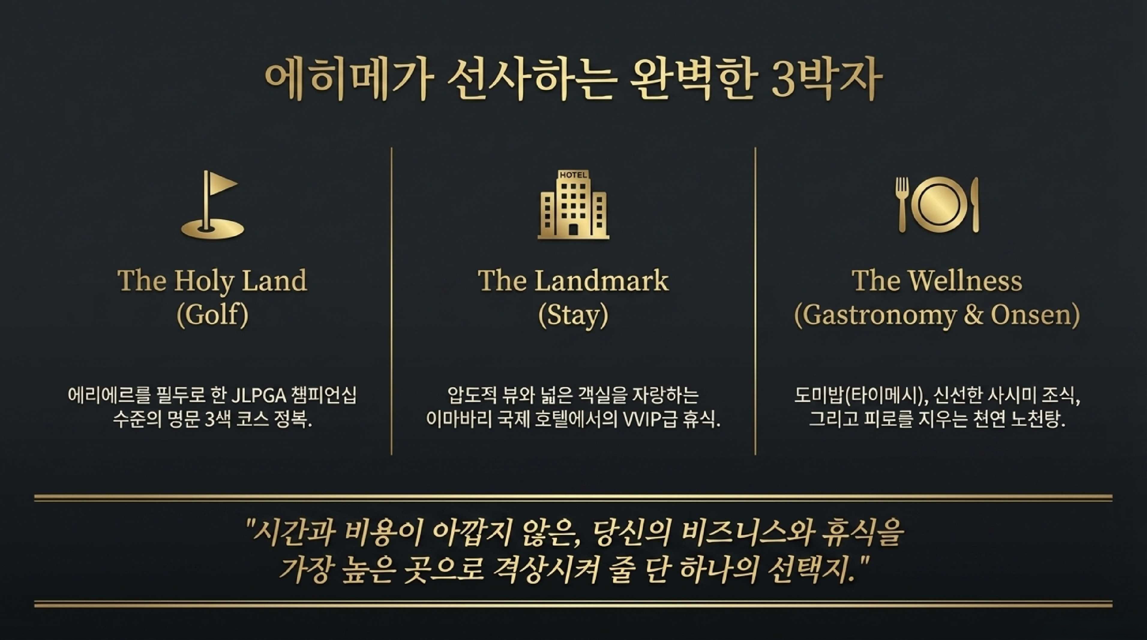 특히 겨울철 국내 골프가 막히는 시기에 잔디 상태 좋은 해외 라운딩을 원하는 골퍼, 파트너 또는 중요한 거래처와의 비즈니스 라운딩을 계획하는 VVIP 고객, JLPGA 대회 코스를 직접 경험하고 싶은 진성 골퍼에게 만족도가 높다. 커플 여행객에게도 적합하다. 라운딩 후 온천과 세토내해 야경은 골프와 무관하게도 충분히 가치 있는 경험이다.
