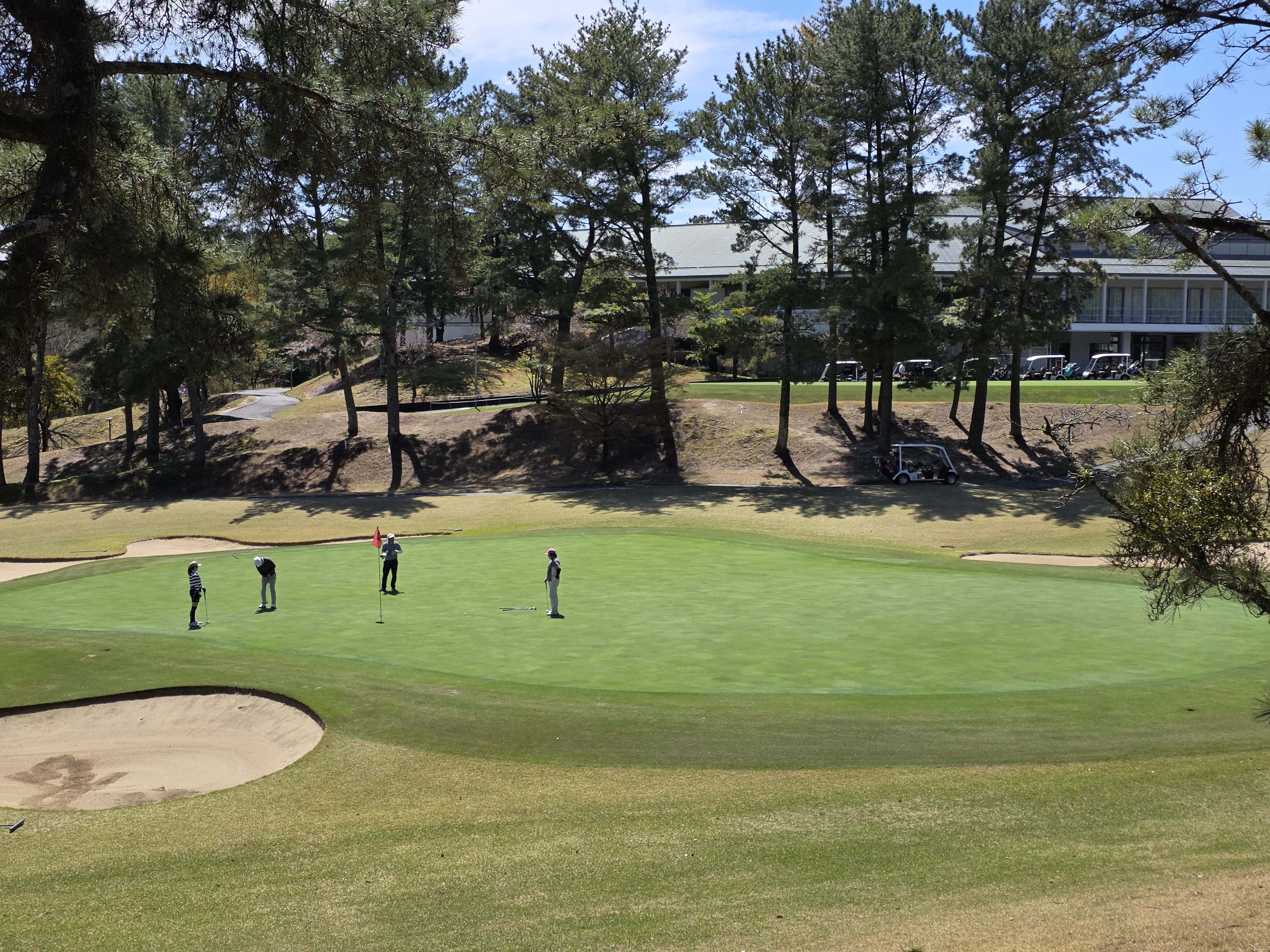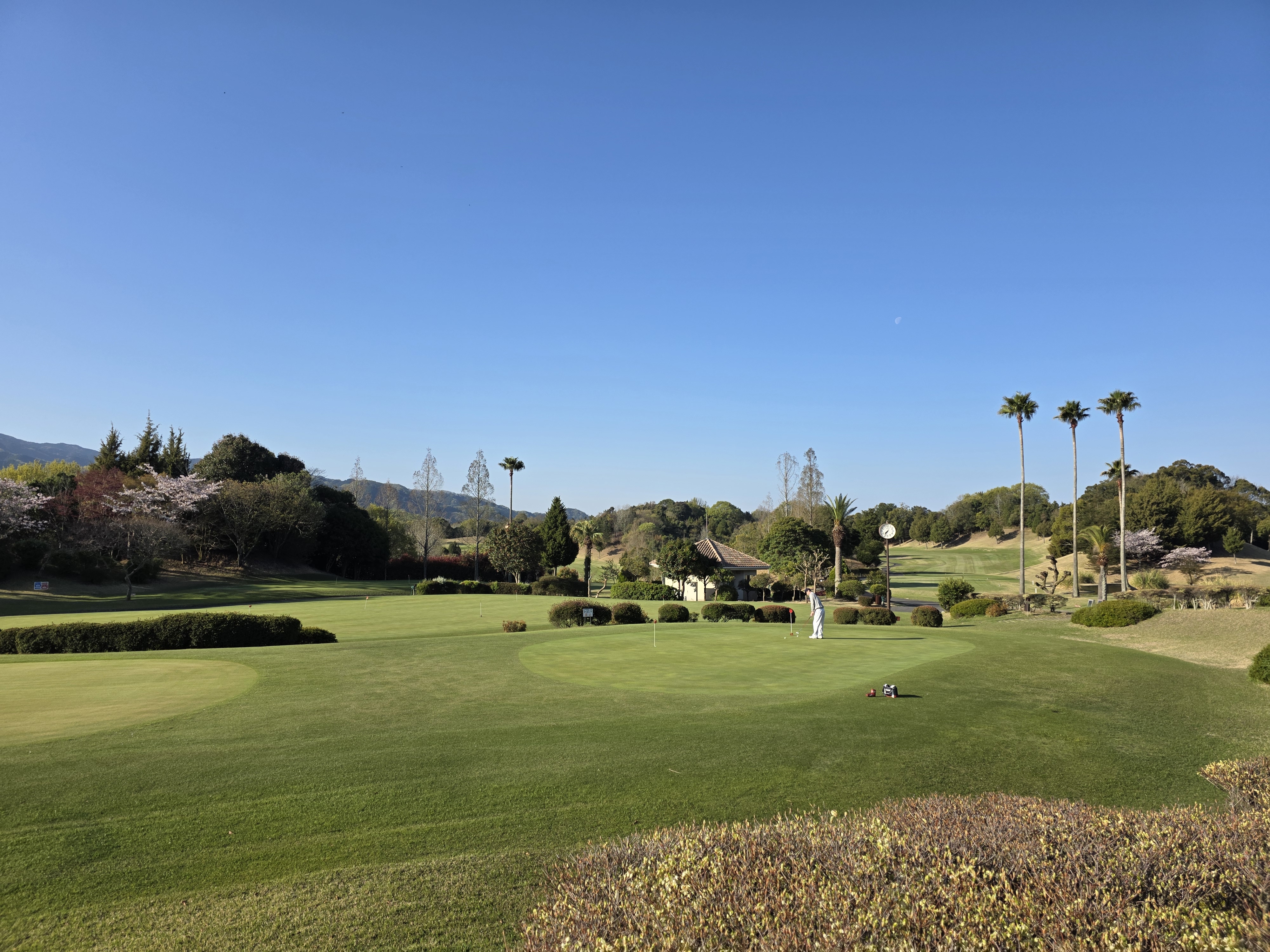 세 코스 중 가장 높은 곳에 있다. 해발 400미터에서 480미터 사이. 고원의 공기는 확연히 다르다. 마쓰야마 시내보다 기온이 낮고, 숨을 들이쉬면 차고 맑다. 페어웨이 위 잔디가 유독 선명해 보이는 것도, 이 고도와 공기 덕분인 것 같다.