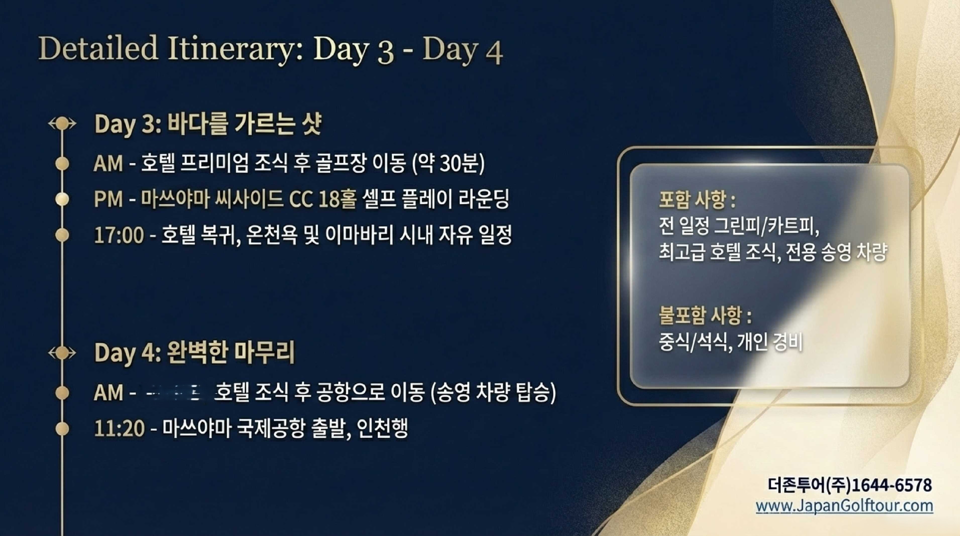 | 3일차 | 썬셋 힐즈 CC 라운딩 (18홀) JLPGA 챔피언십 코스 체험 TOPHAT 스카이바 야경 감상 |