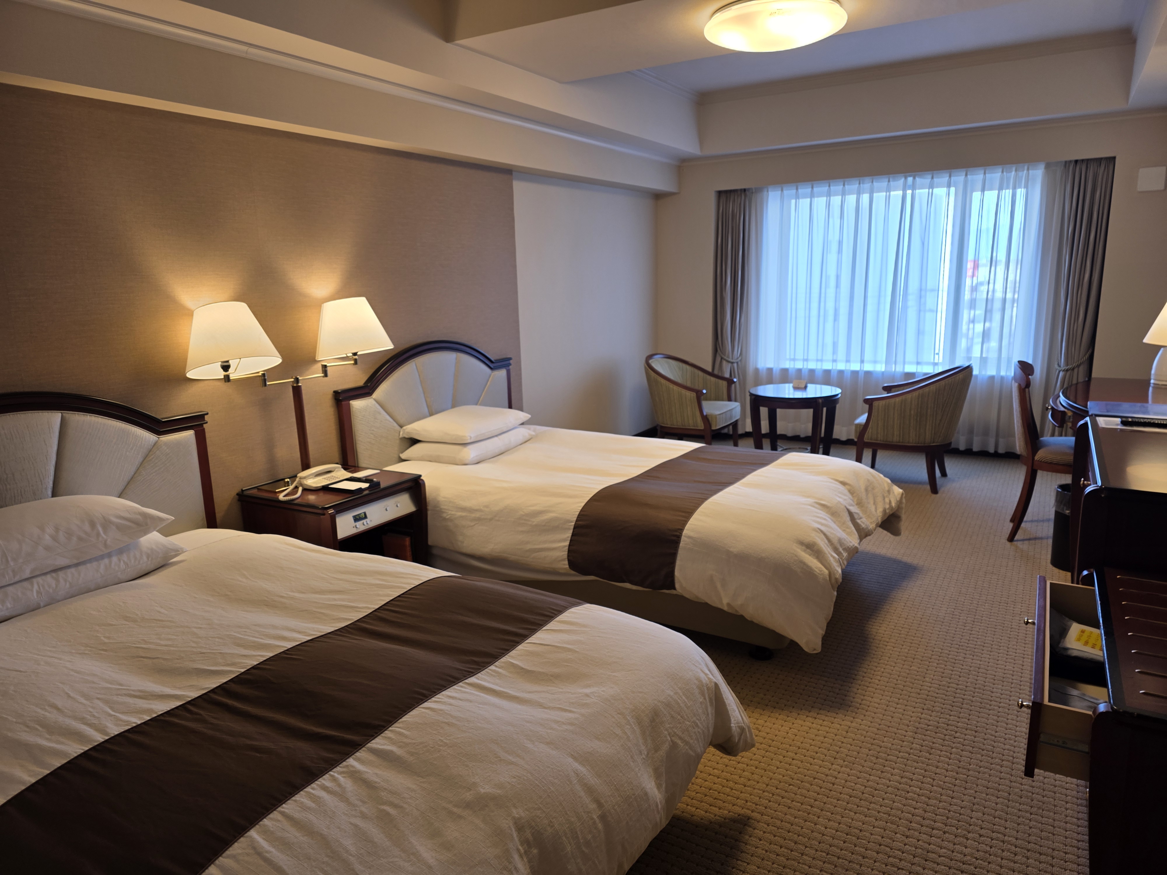 객실은 타워동과 아넥스동(신관)으로 나뉜다. 우리는 아넥스 트윈룸을 혼자 사용하는 호사를 누렸는데 현대적이고 차분한 감성으로, 넓은 욕실에 세계적으로 유명한 이마바리 타월이 비치돼 있다.