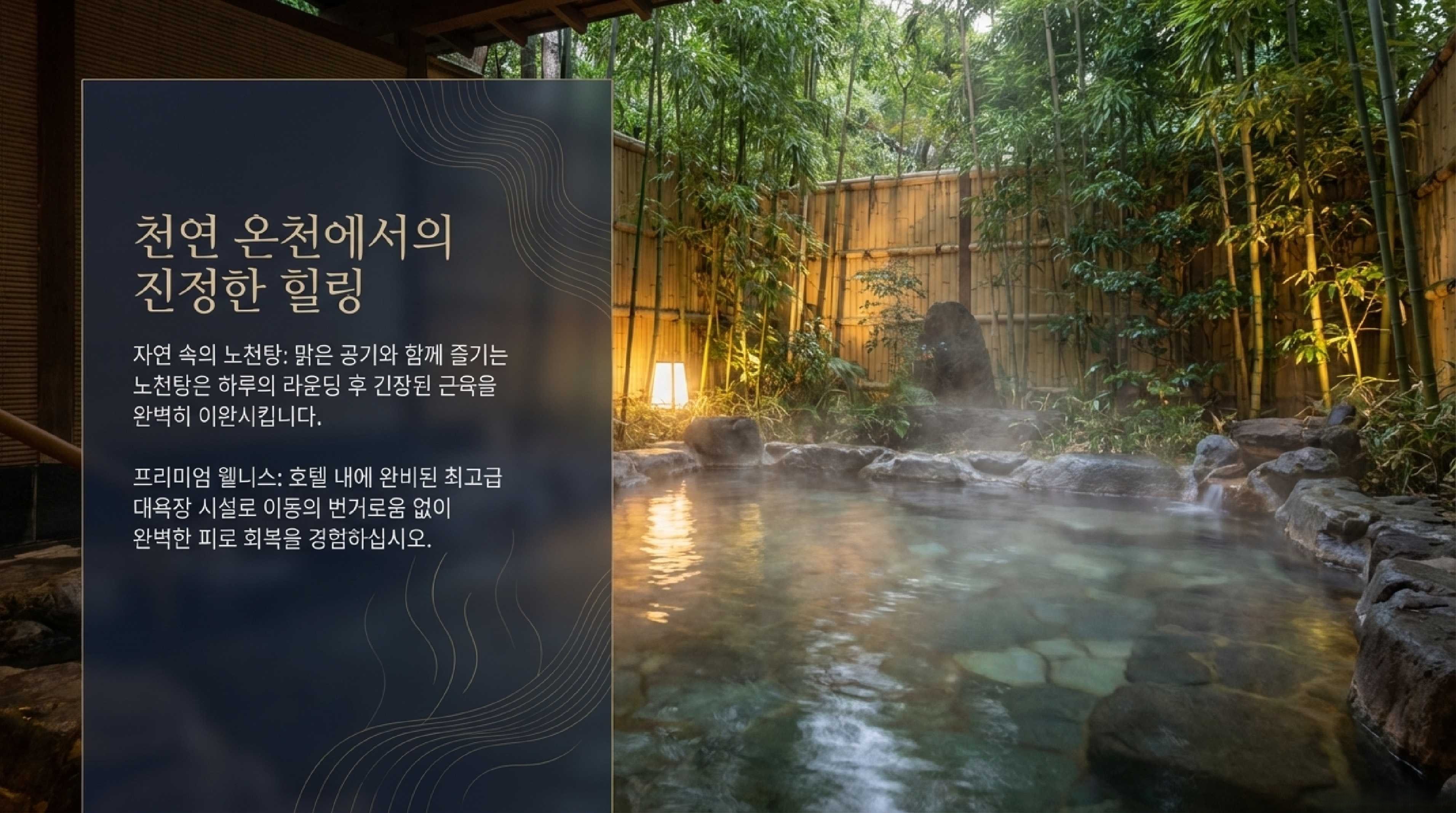 프리미엄 웰니스 - 호텔내에 완비된 최고급 온천 대욕장 시설로 외부 이동의 번거로움 없이 라운드후의 피로를 풀수 있다. 노천탕에서 즐기는 온천욕의 즐거움은 더 큰 매력이다.
