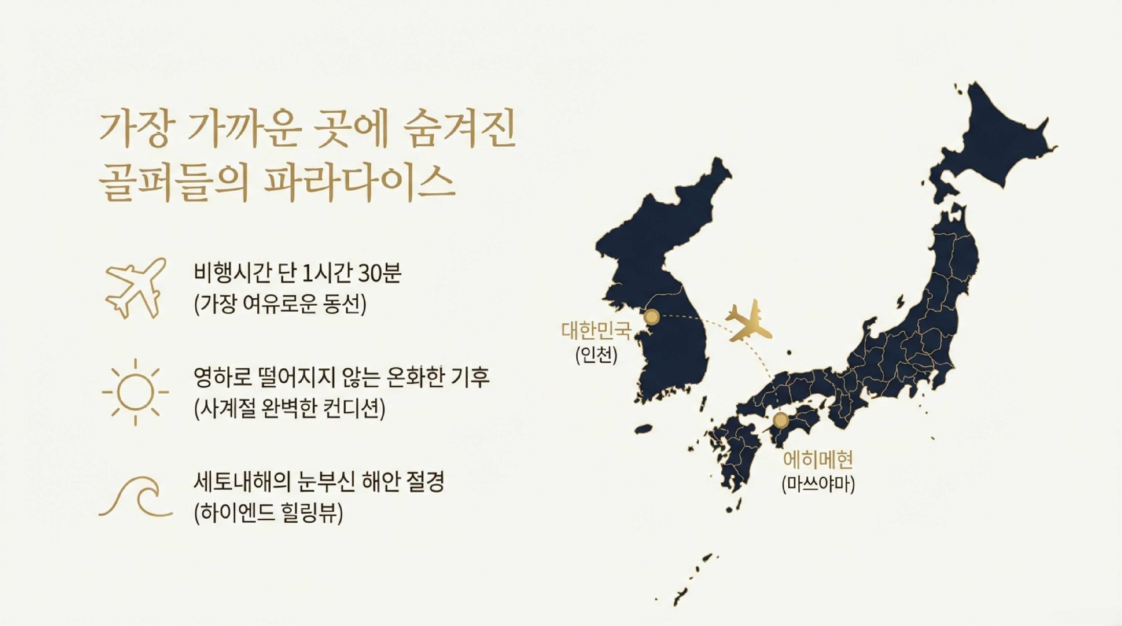 에히메 골프 여행의 가장 큰 장점은 기후다. 세토내해의 온화한 해양성 기후 덕에 연중 영하로 내려가는 날이 없고, 겨울에도 페어웨이는 살아 있다. 에히메현 전체에 21개의 골프장이 있고 대부분 30분에서 1시간 이내면 닿는다.