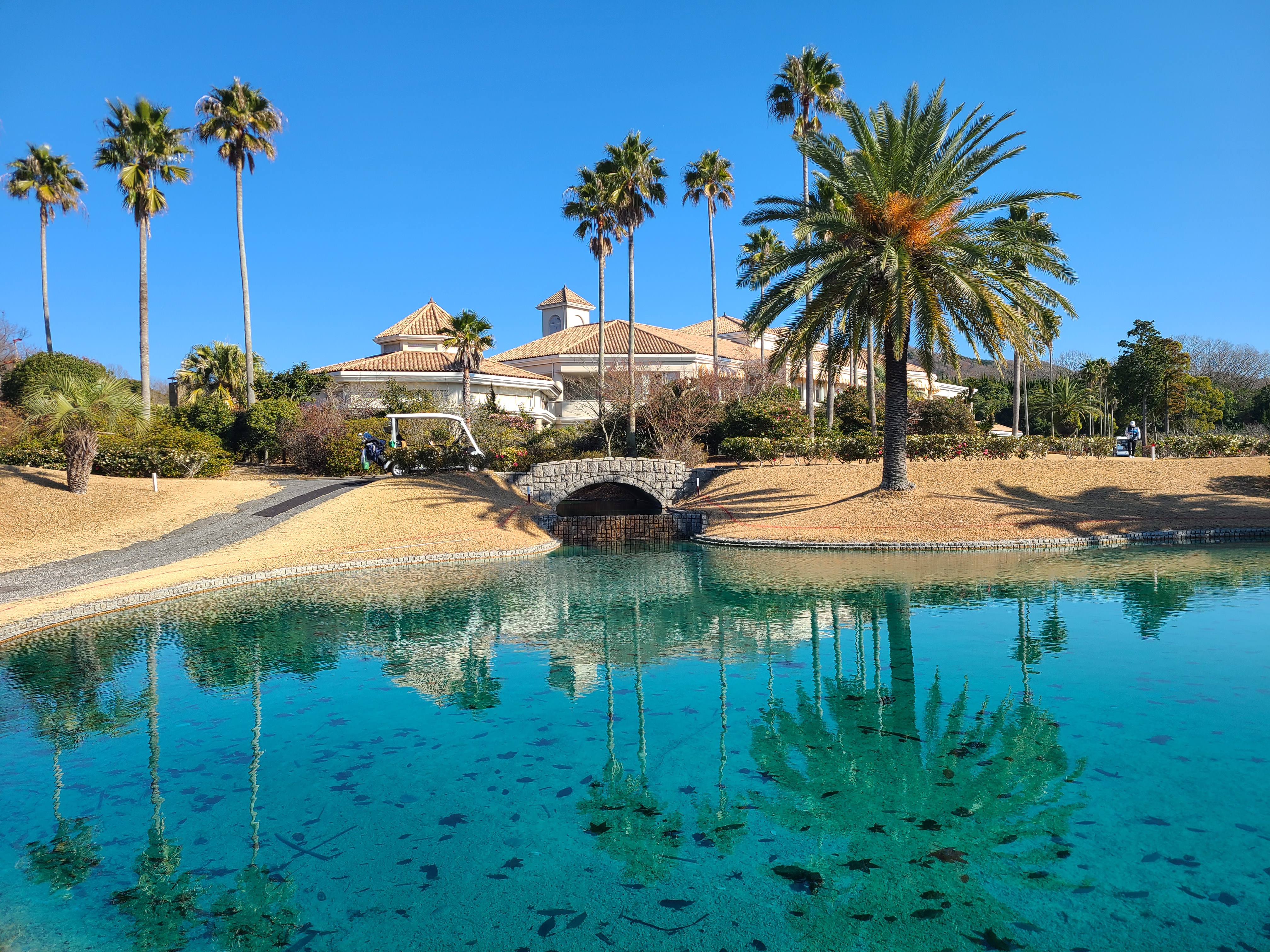 2번 홀은 오른쪽 도그레그에 내리막 경사가 겹쳐 있다. 티잉 구역에서 내다보면 야자수 사이로 바다가 보이는데, 왠지 모르게 동남아 리조트 코스 같은 이국적인 인상을 준다. 시코쿠 섬의 4월 오전이라는 사실이 잠시 잊힌다.