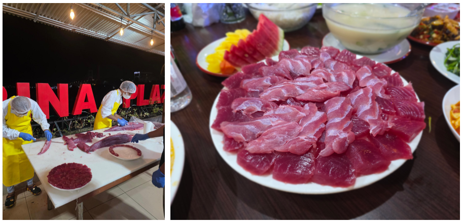 출국전 공항으로 가기전에 해변 식당에 들렀다. 마나도 앞바다에서 잡아 올린 참치 해체 행사가 있었다. 마나도는 세계적인 참치 어장으로 유명하다. 리조트 해변 식당에서는 갓 잡아 올린 40kg 규모의 거대 참치 해체쇼가 열렸다 (별도 비용 발생). 조리사의 예리한 칼끝에서 분리되는 선홍빛 참치회는 입안에서 녹아내렸다.