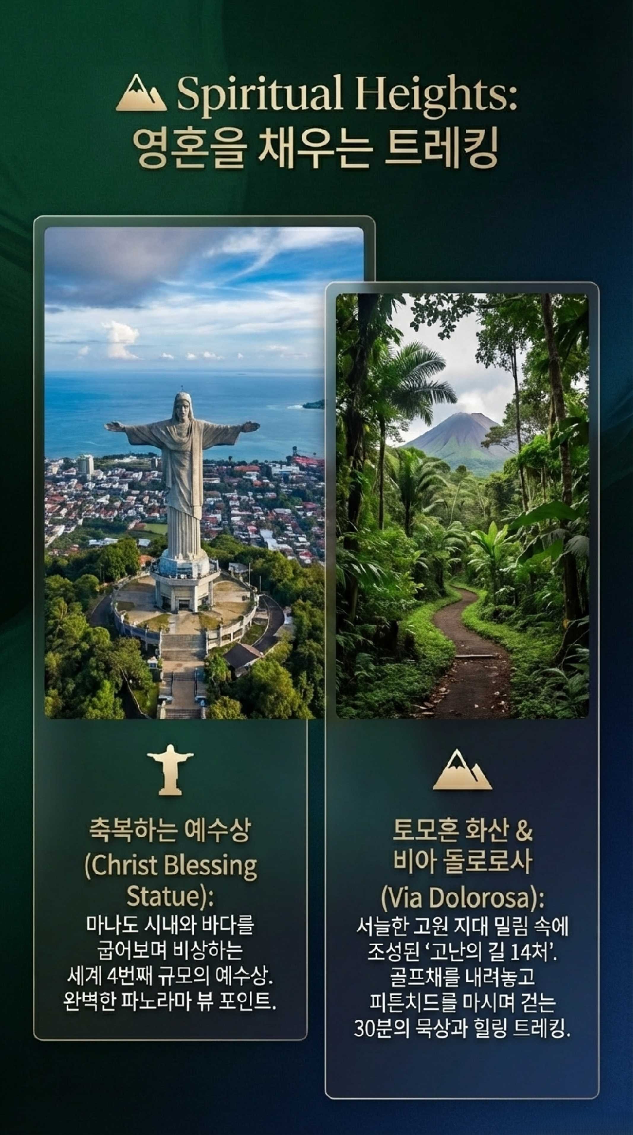 토모혼 화산 고원의 울창한 밀림 속에는 '비아 돌로로사(Via Dolorosa)'라 불리는 1.5km의 트레킹 코스가 있다. 예루살렘의 고난의 길을 재현한 십자가의 길 14처 조형물을 따라 걷는 이 길은, 정부가 아닌 한 개인의 깊은 신앙심으로 조성되어 그 의미가 더욱 남다르다.
