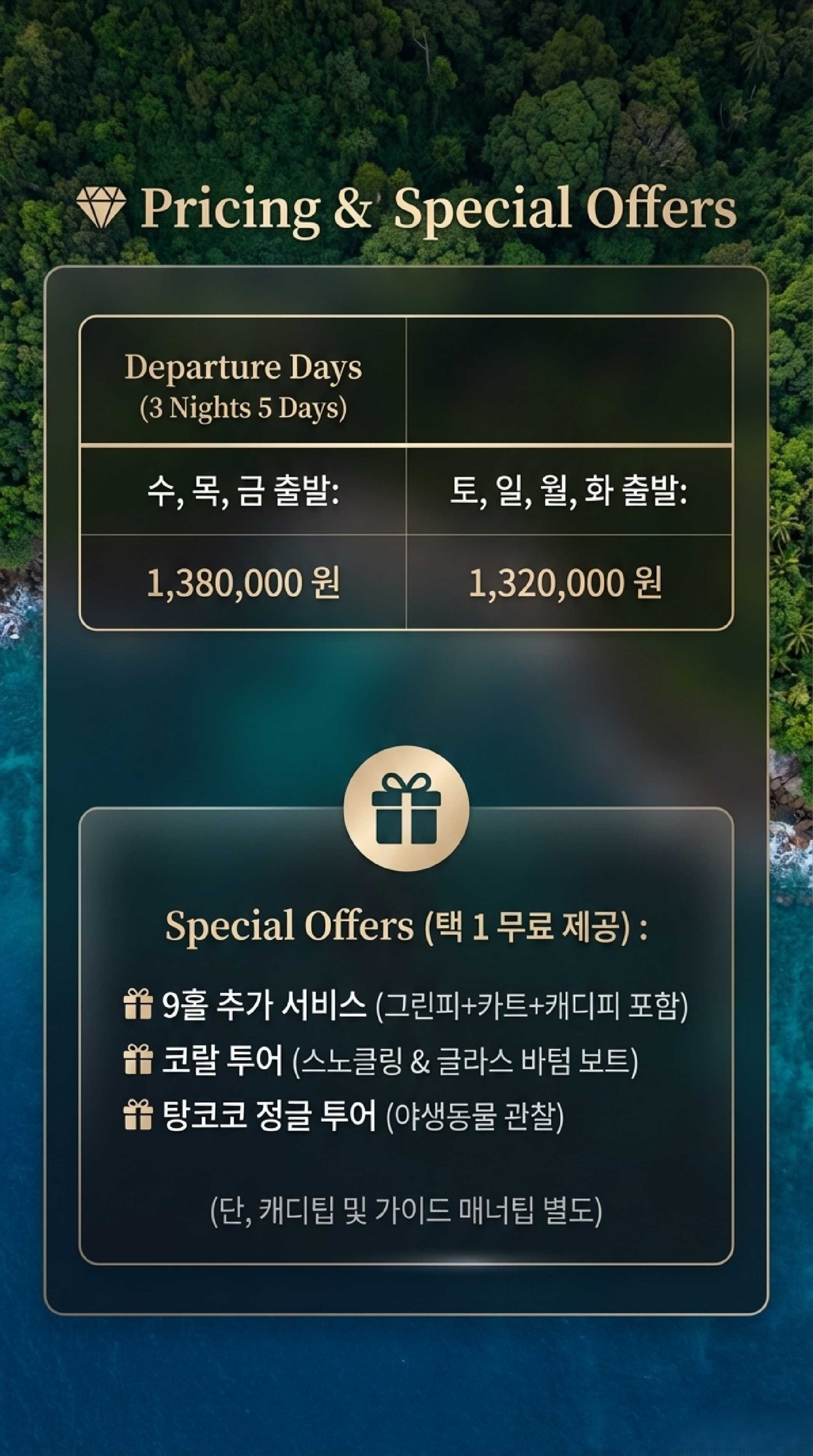 ▷ 골프와 함께 세계적인 스노클링, 화산 트레킹 등 인문학적 감성을 채우고 싶은 분