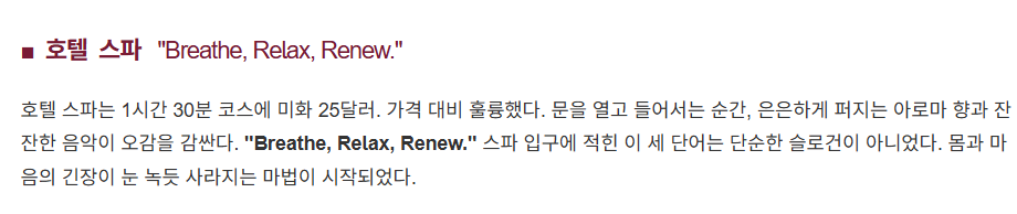 유료 서비스로 제공되는 호텔 스파센터에 뜨거운 스톤의 온기가 느껴지는 맛사지 또한 놓칠 수 없는 즐거움이다.