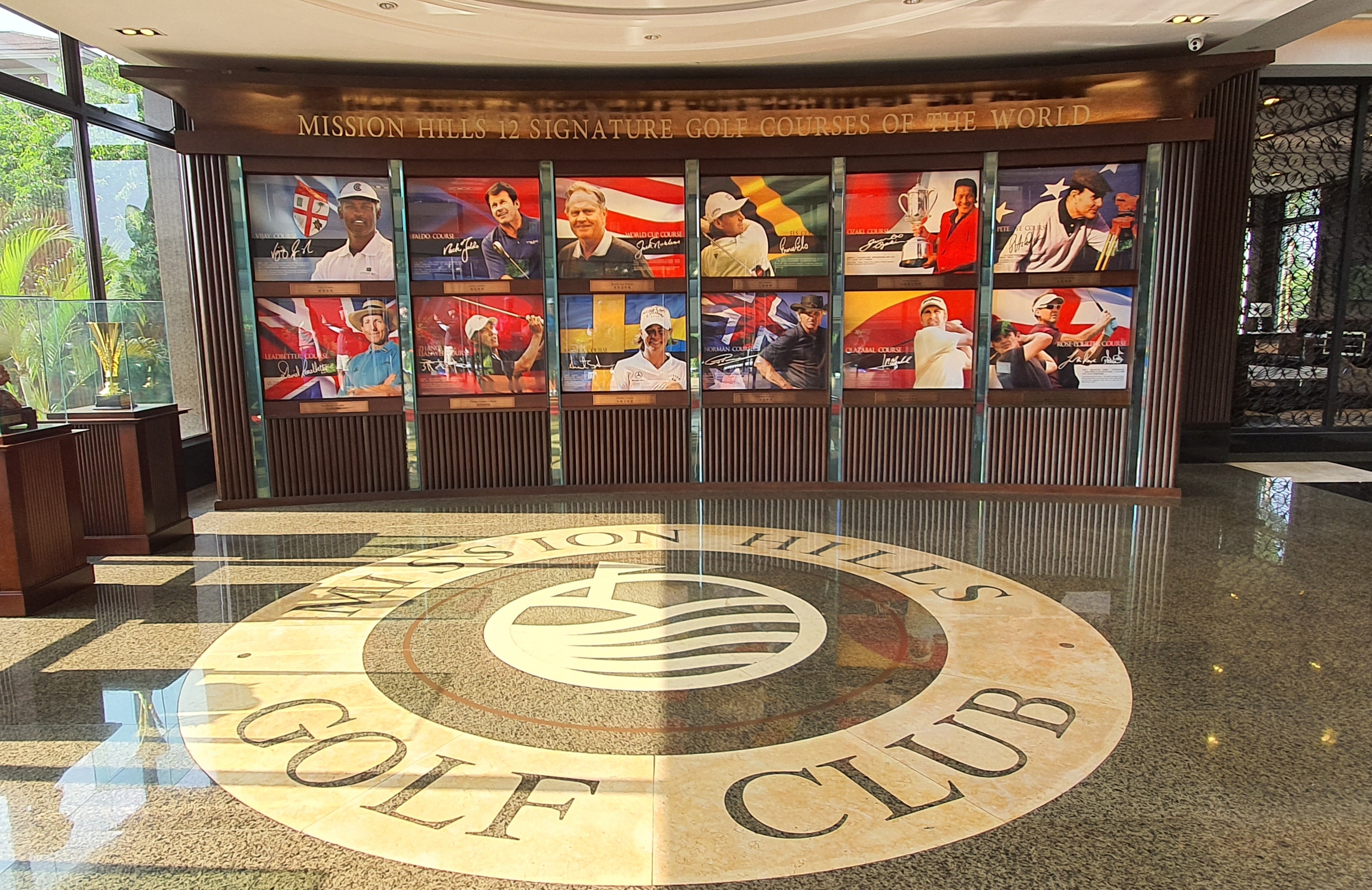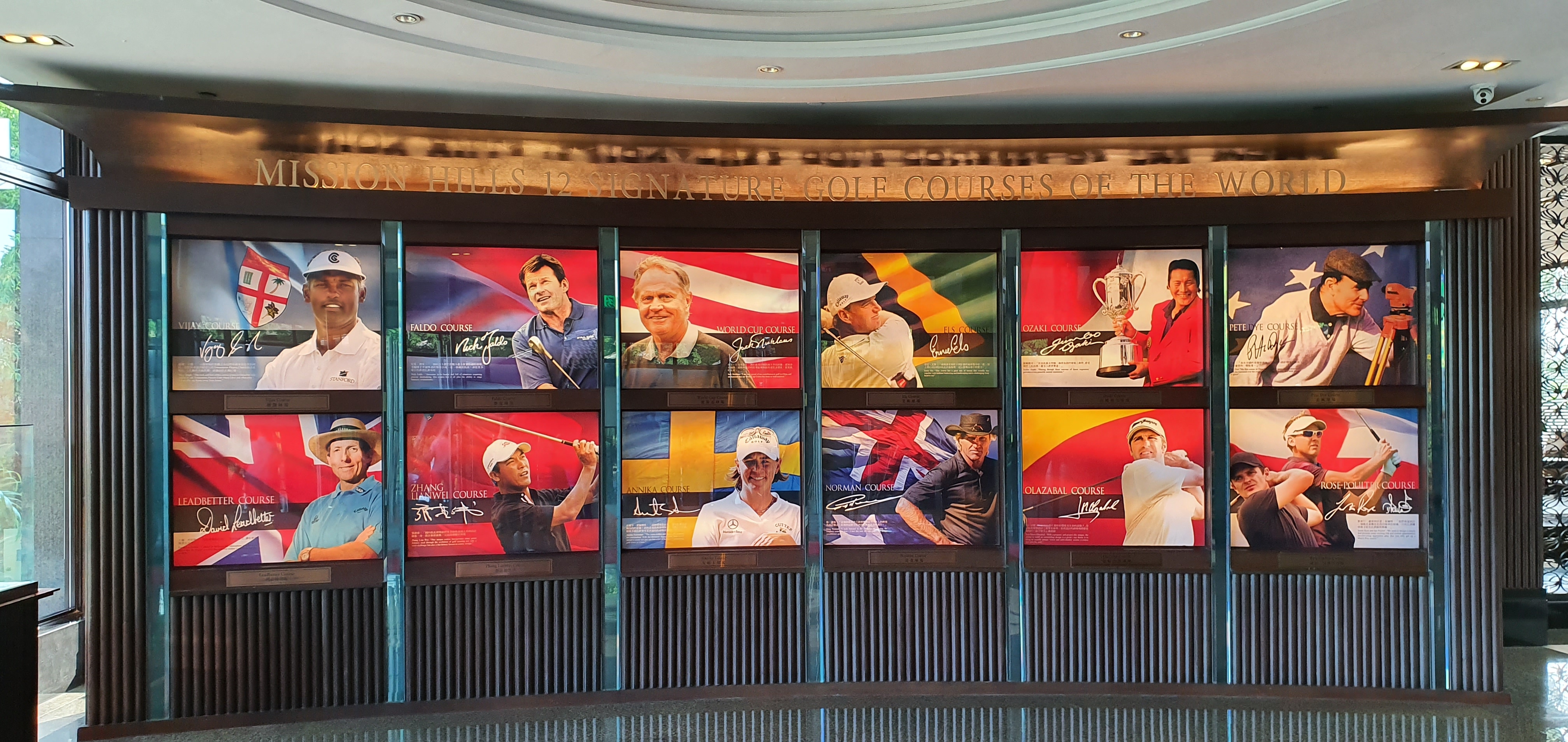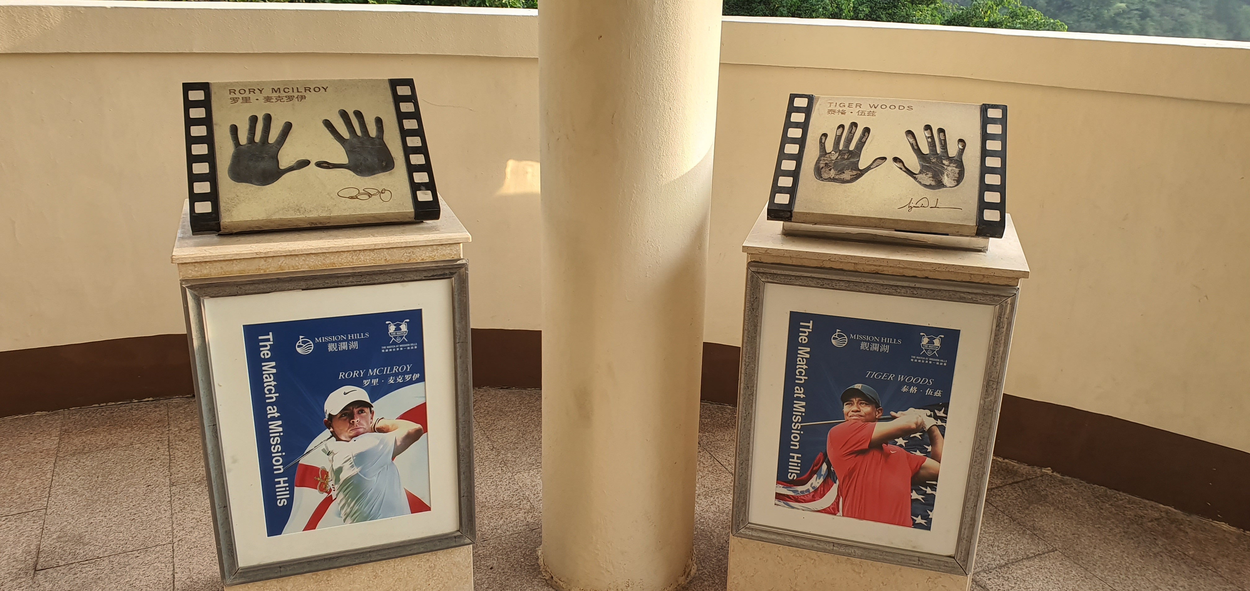 스타플레이어 헨드프린트와 포토존 - 동관, 심천 두 곳 클럽하우스로 가는 회랑에 골프 스타들과 은막의 스타들까지 백여개의 핸드프린트가 전시되어 있습니다. 사진은 세기의 맞수로 유명한 로이 맥길로이와 타이거 우즈가 나란히 서있다. 타이어우즈의 손이 생각 보다 많이 작아서 뜻 밖이었습니다. 잡지의 표지모델을 연상케 하는 포토존이 재미납니다. 모든 코스의 1번 홀에 설치되어 있습니다.