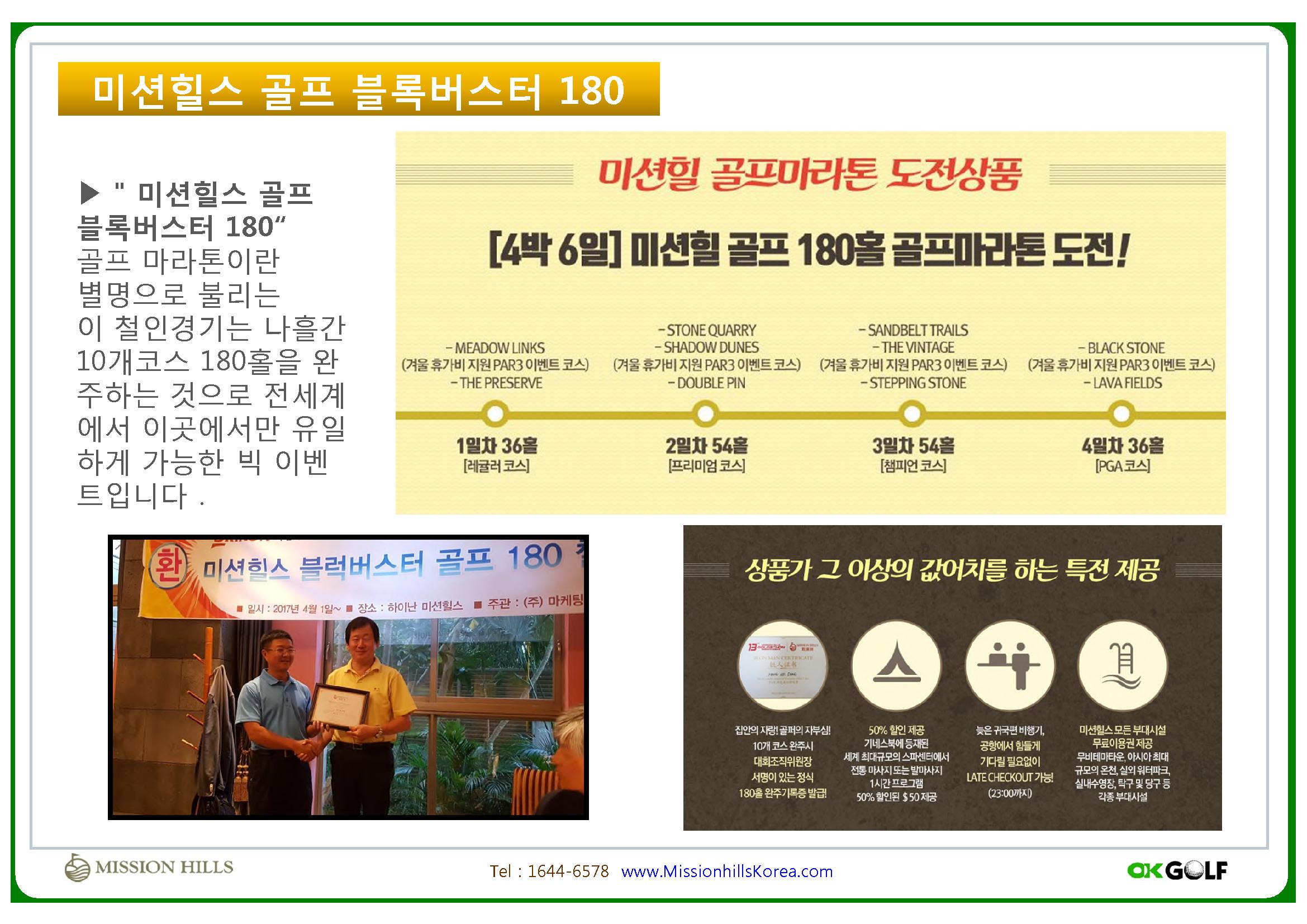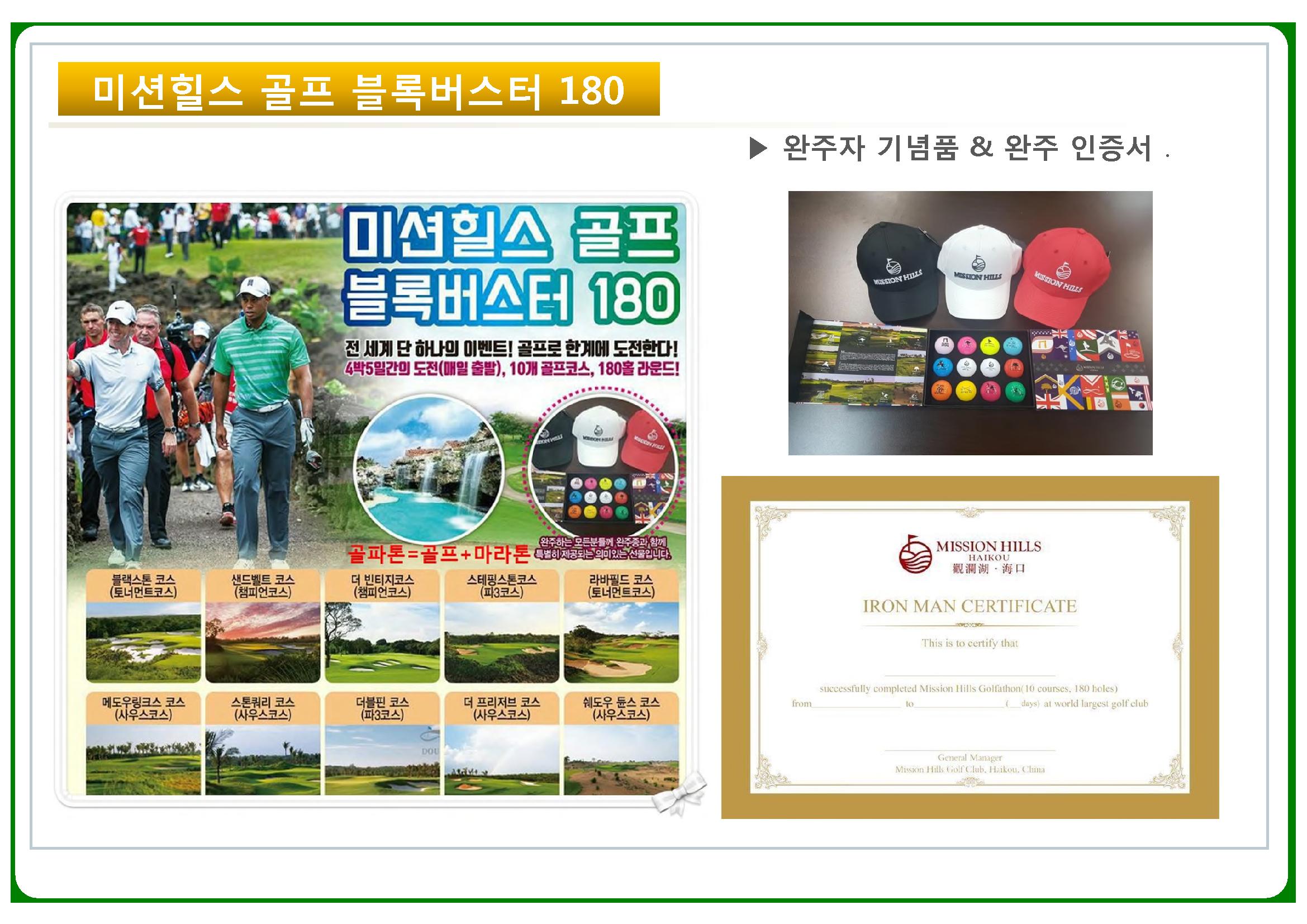 " 미션힐스 골프블록버스터 180"- 골프 마라톤이란 별명으로 불리는 이 철인경기는 나흘간 10개코스 180홀을 완주하는 프로그램으로 전세계에서 이곳에서만 유일하게 가능한 빅 이벤트입니다. 특히, 이번 행사에는 중식을 리조트 뷔페식으로 포함해 더 여유 있는 일정으로 행사가 진행됩니다.