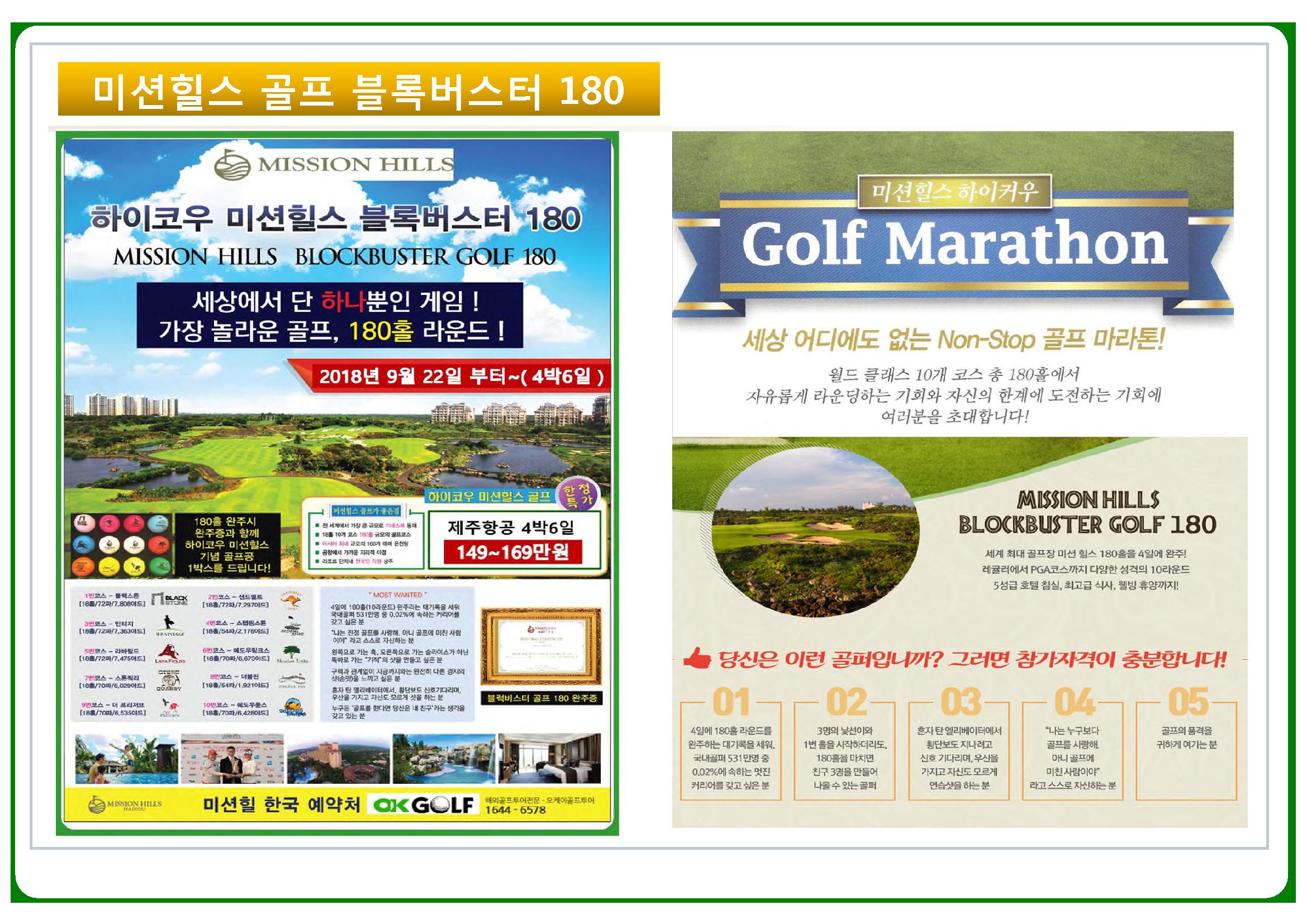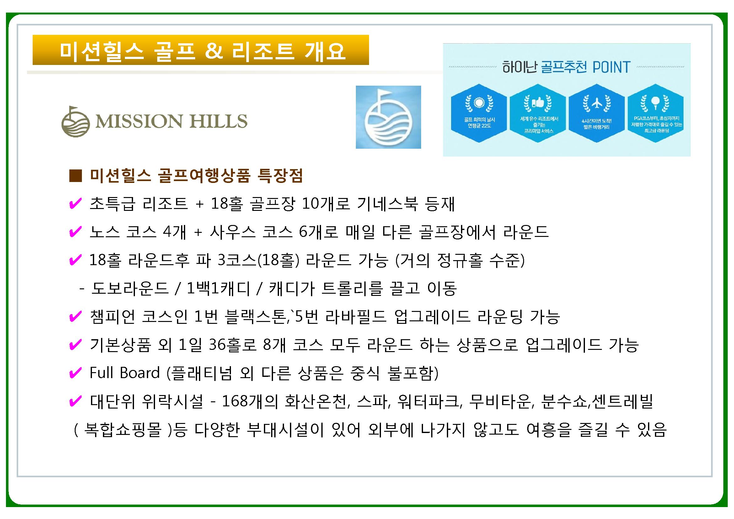 - 4일간 미션힐스 10개 코스를 모두 라운딩 (180홀)하는 상품