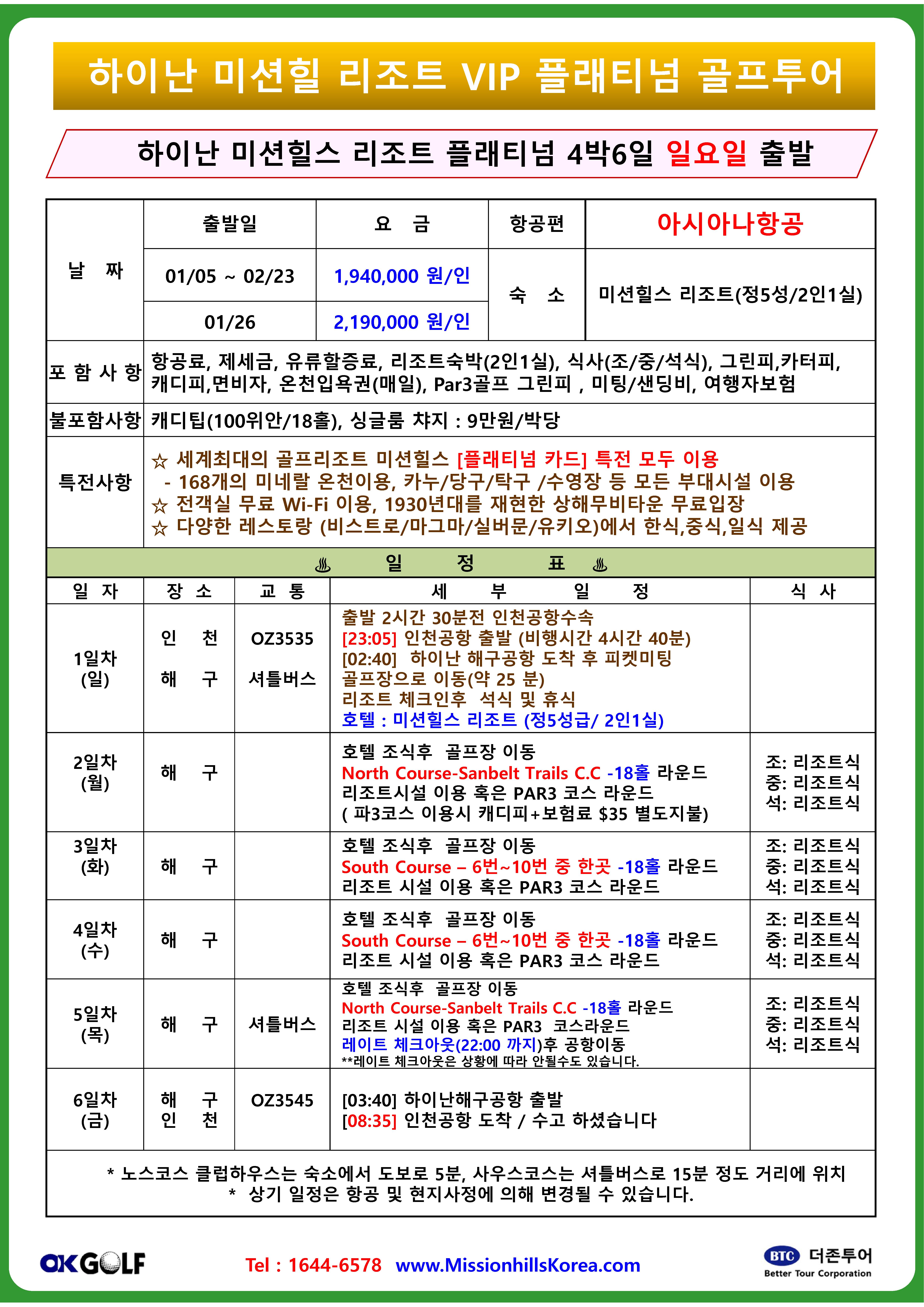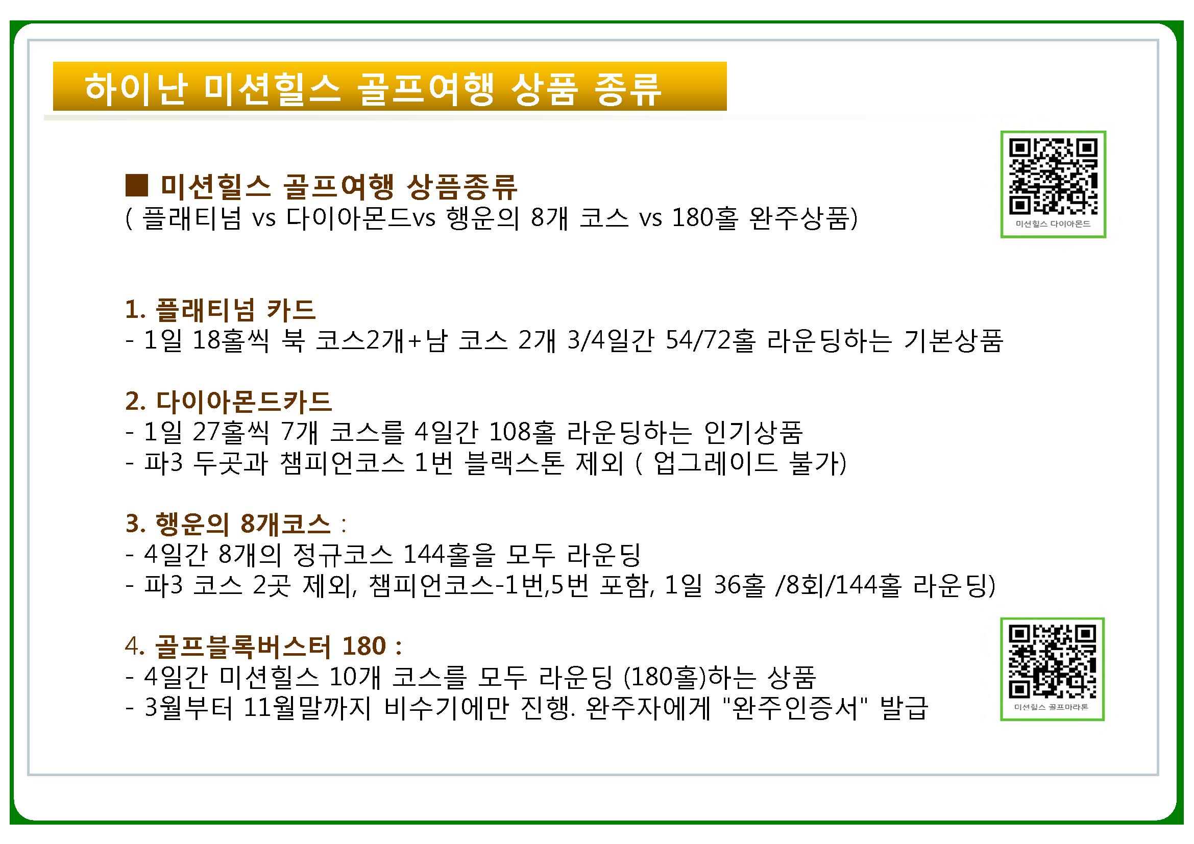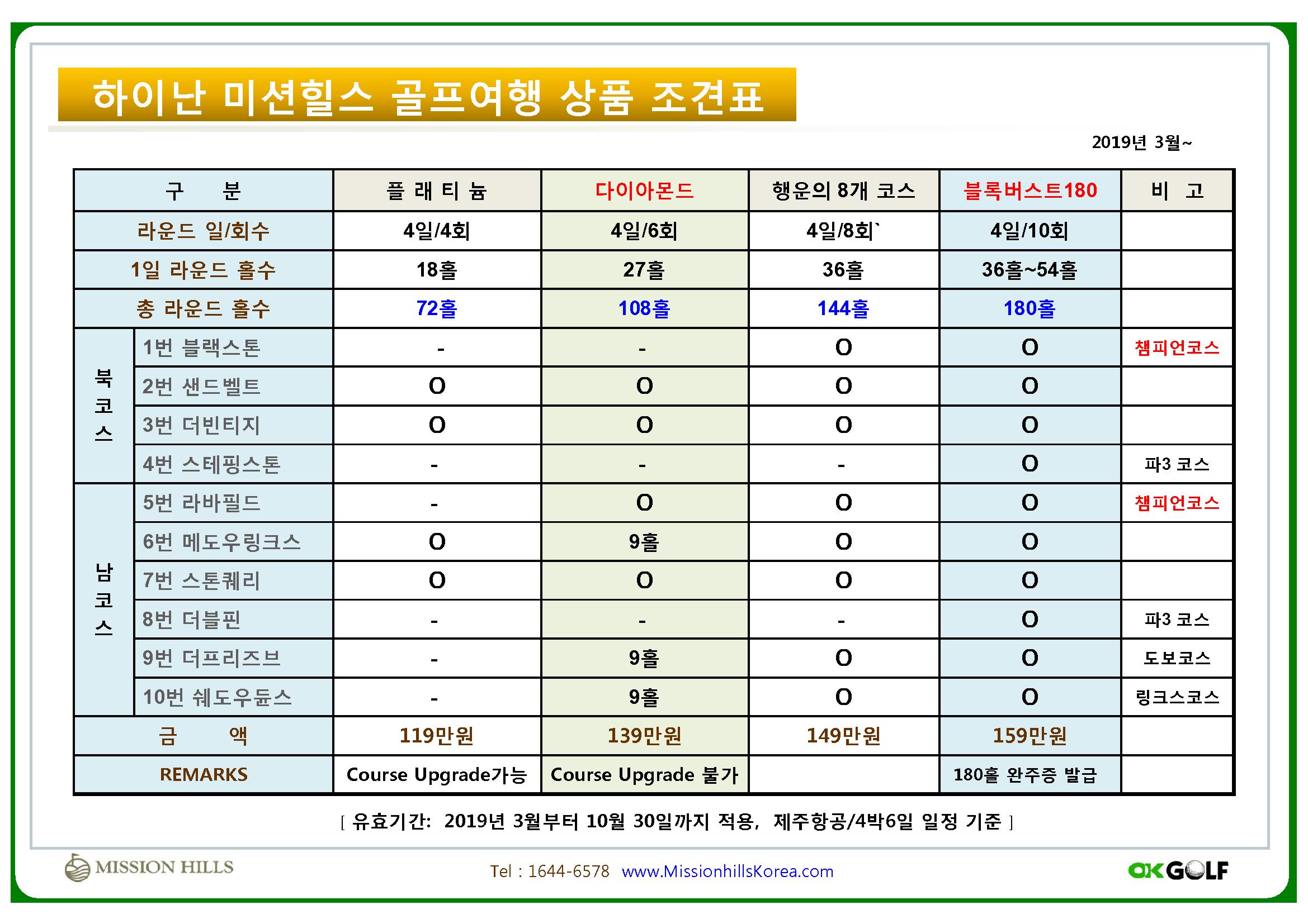 | 하이난 미션힐스 골프여행상품 조견표 (0) | 2019.01.11 |