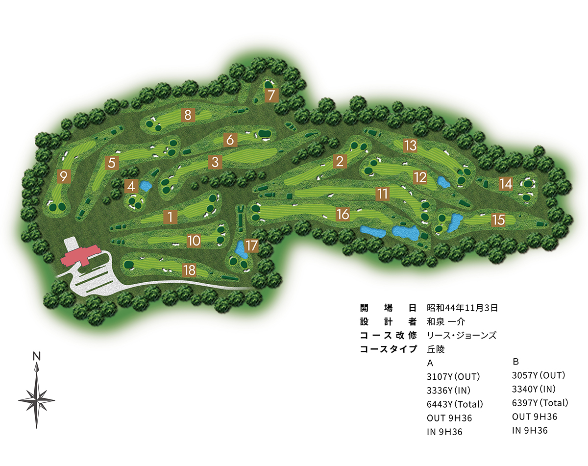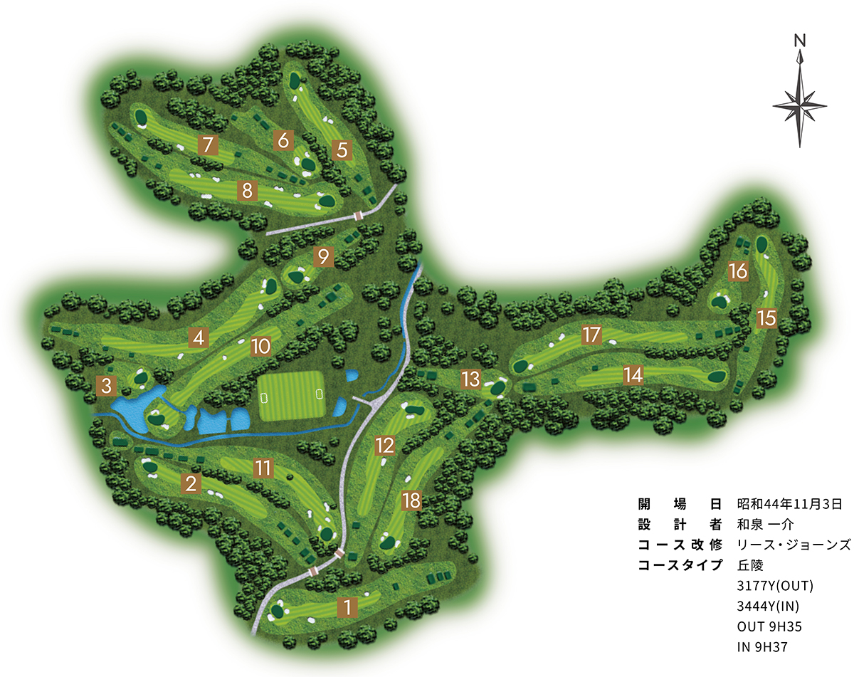 세계적인 유명 설계가 리스 존스에 의해 리뉴얼 된 세계 수준의 36HS 골프장. 코스는 변화와 전략성이 가득한 오가사와 다카마쓰의 2코스. 카트에 GPS 카트 네비게이션 시스템을 도입. 코스 공략에 필요한 정보를 알 수 있다.