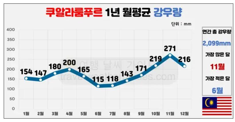 < 쿠알라룸푸르 강우량 - 앞서 설명대로 6~8월 강수량이 가장 적다. 11월이 가장 많다. 열대지방의 강우는 우리나라 장마비와 달리 스콜(소나기) 형태로 내리는 경우가 많다. 소나기를 피하고 경기를 재개하기 때문에 라운드를 못하는 경우는 거의 없다 >