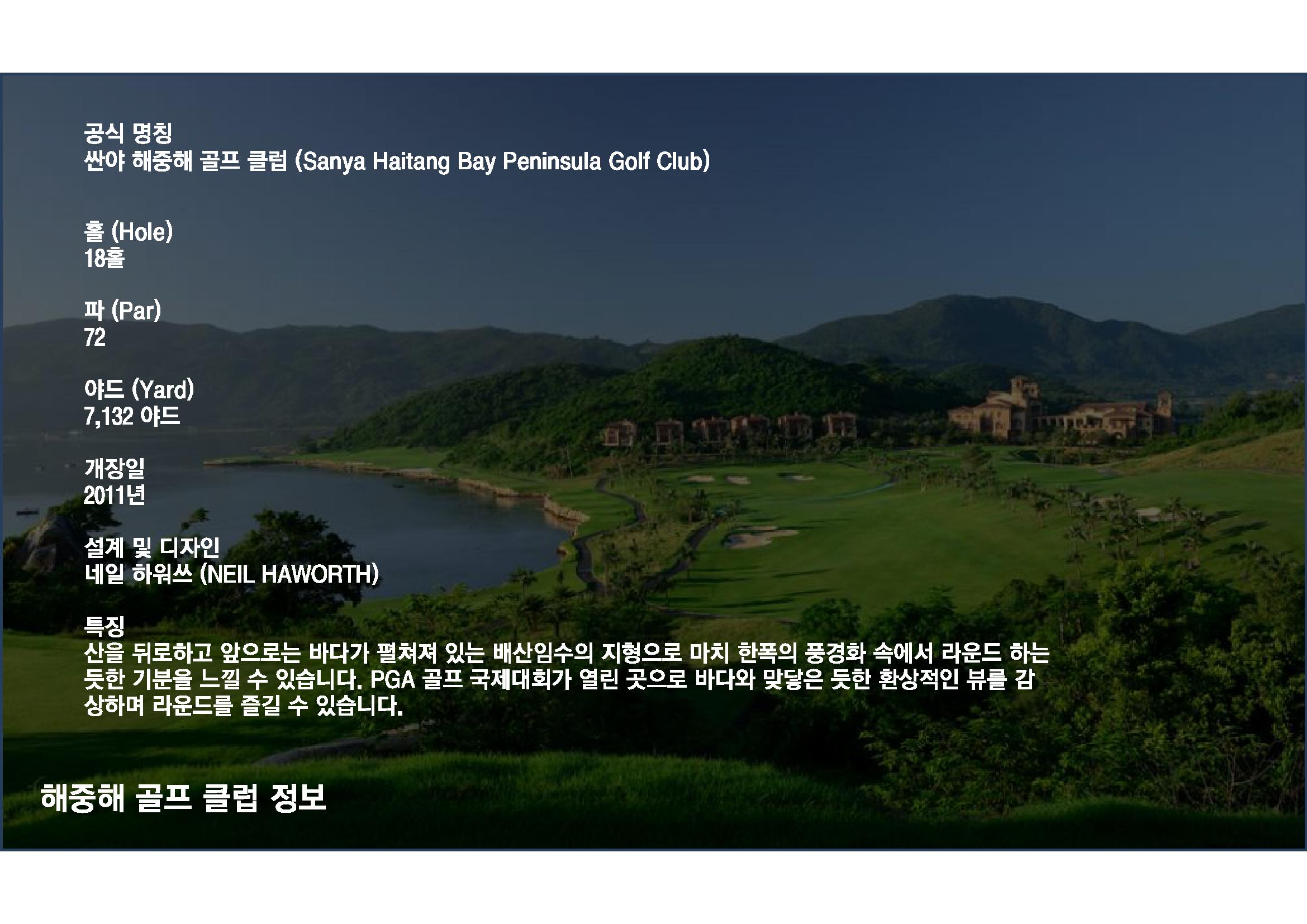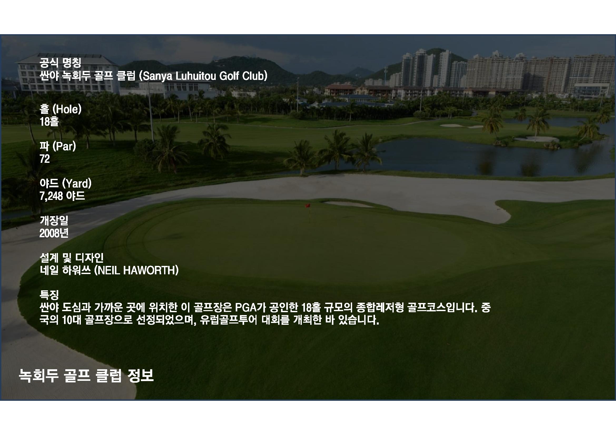 일정에 포함된 해중해 GC와 녹회두 GC는 블루베이 GC와 동급인 PGA 공인 기준의 세계적 코스이다.