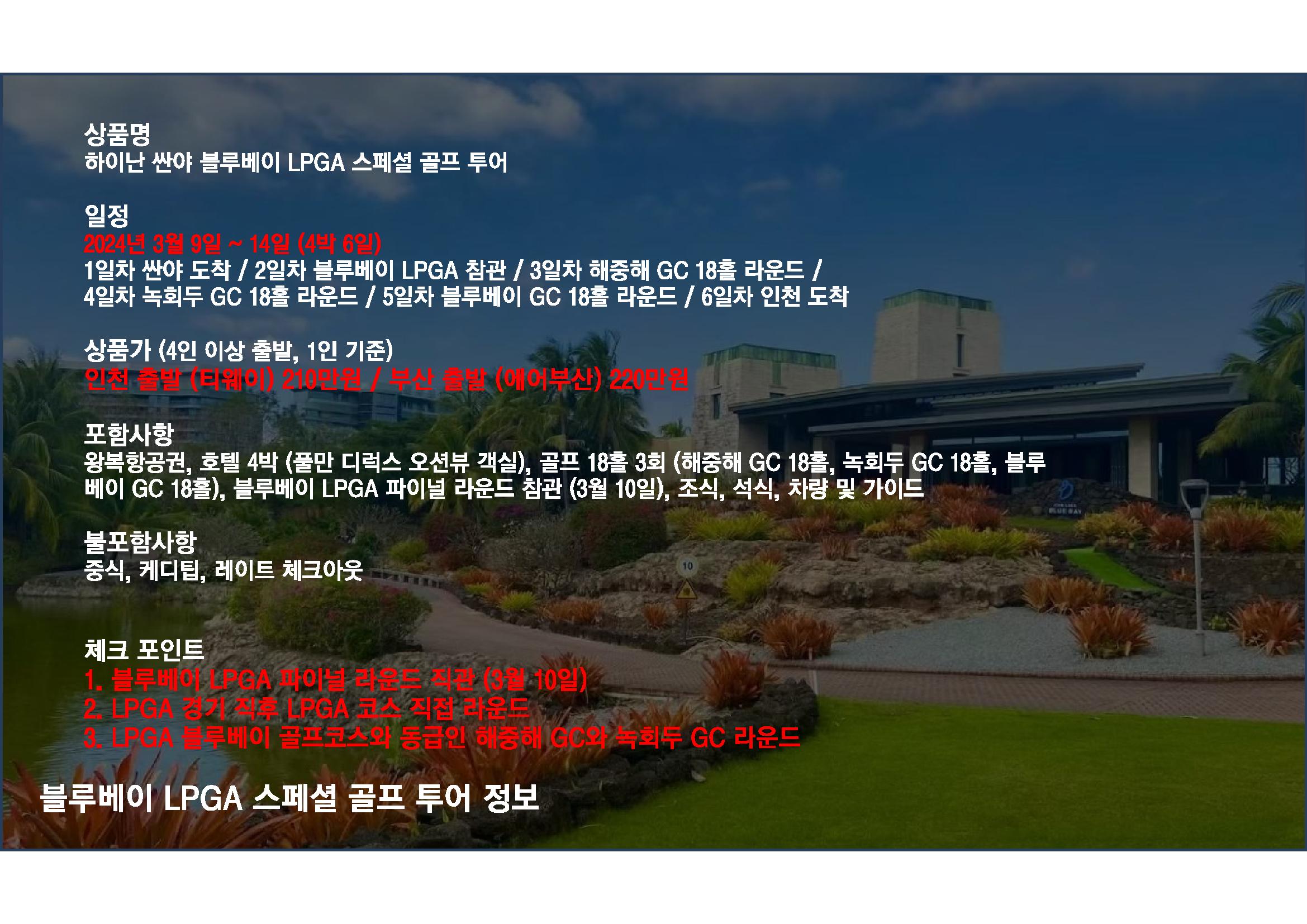 2024년 3월9일부터 14일까지 4박6일 일정으로 블루베이 LPGA 결승전 참관과 대회 후 블루베이 GC 18홀 라운드를 포함한 '하이난 싼야 블루베이 LPGA 스페셜 골프투어'를 선보인다. 주요 일정은 아래와 같다.