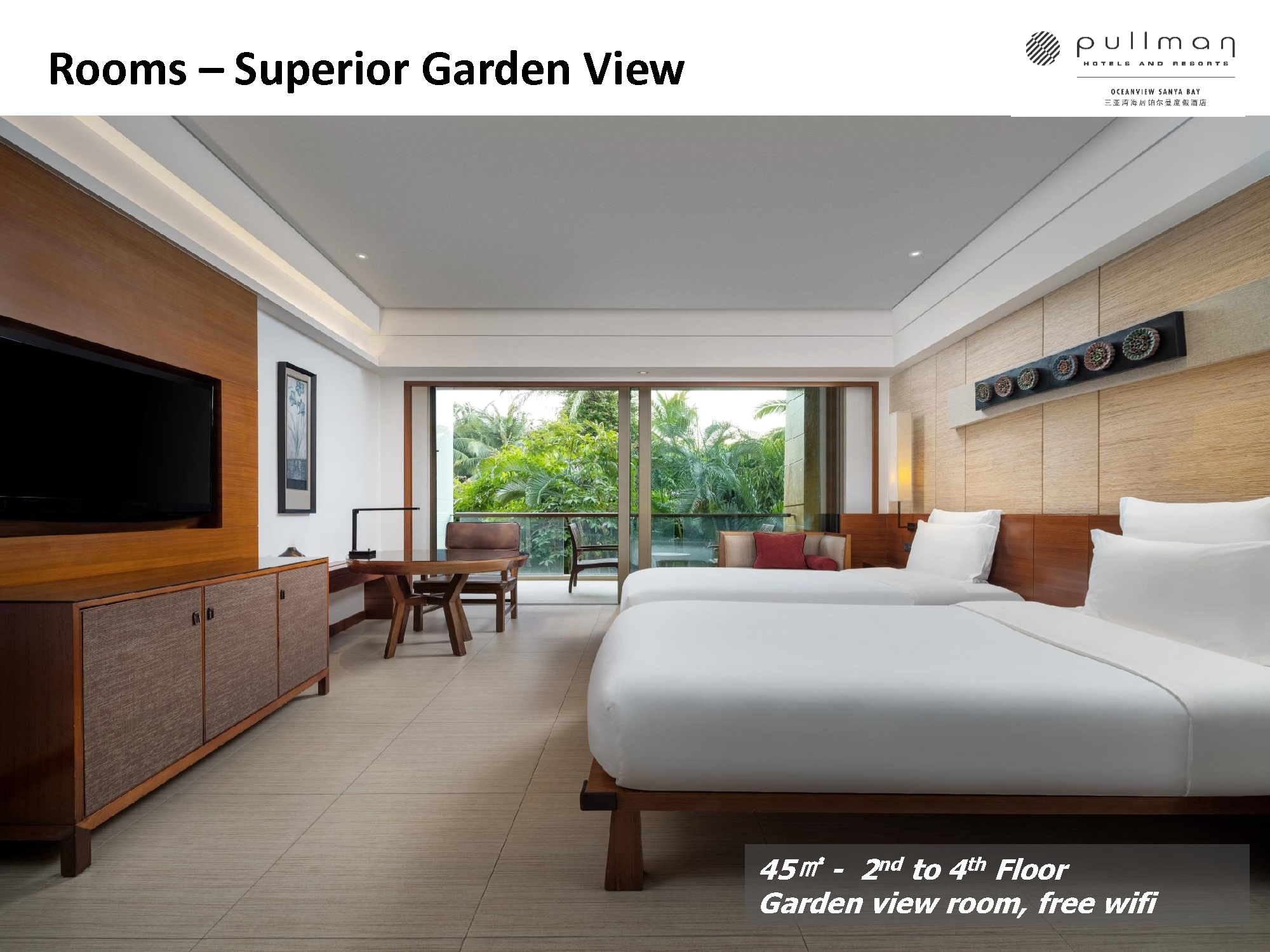 숙소는 세계적인 럭셔리 호텔 브랜드 풀만(Pullman) 브랜드의 '풀만 오션뷰 싼야 베이 리조트 앤 스파'(Pullman Oceanview Sanya Bay Resort & Spa)의 디럭스 오션뷰룸을 제공한다.