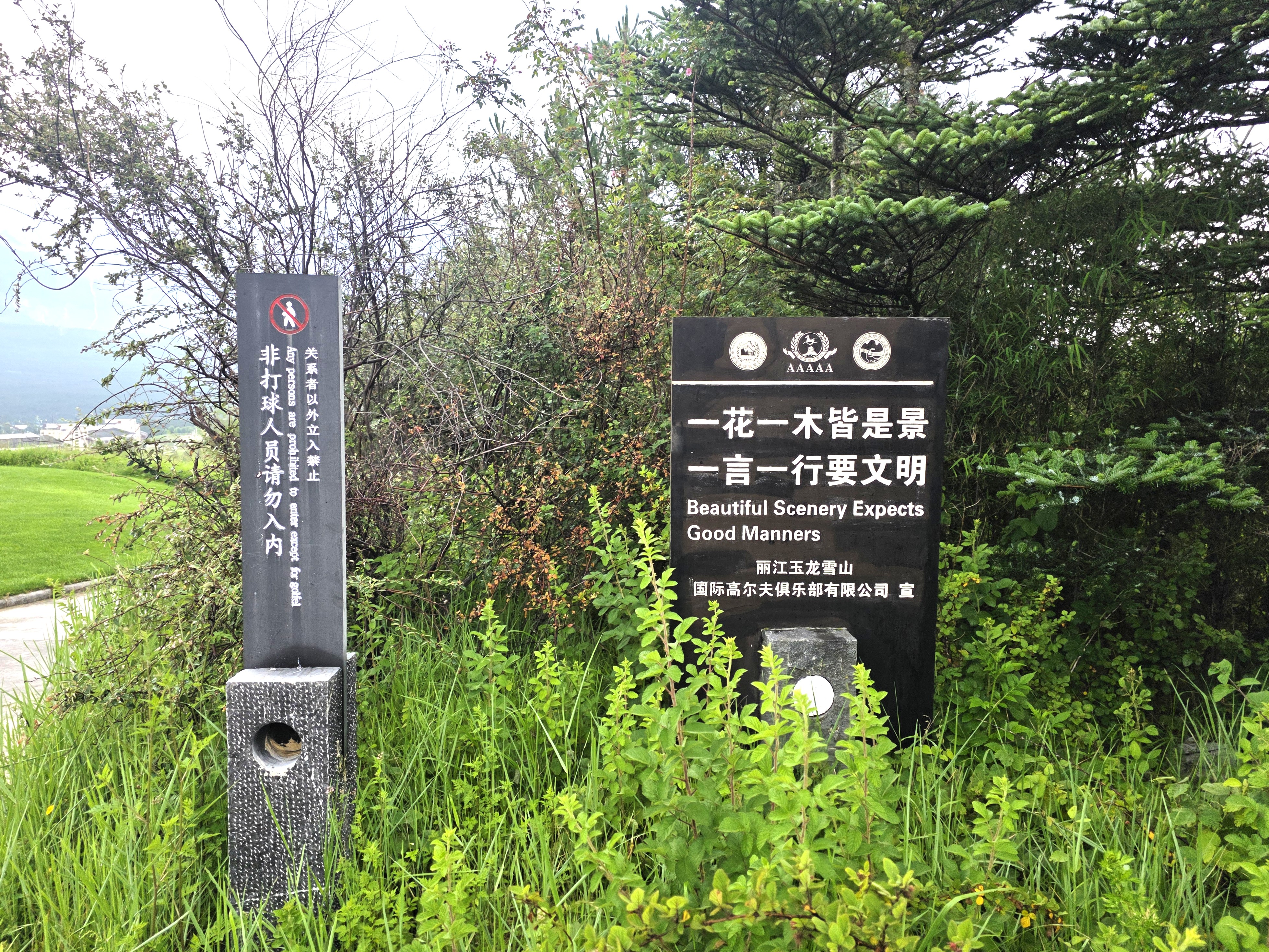이 포스트는 방문객들에게 옥룡설산 골프 클럽의 아름다운 자연을 소중히 여기고, 그에 걸맞게 예의 바른 행동과 에티켓을 준수하여 자연을 보호해 달라는 환경 보호 및 이용 수칙 안내 메시지다. 짧은 두 대귀가 가독성을 높이고 마치 시 처럼 읽혀지는 한자의 매력이 돋보인다.