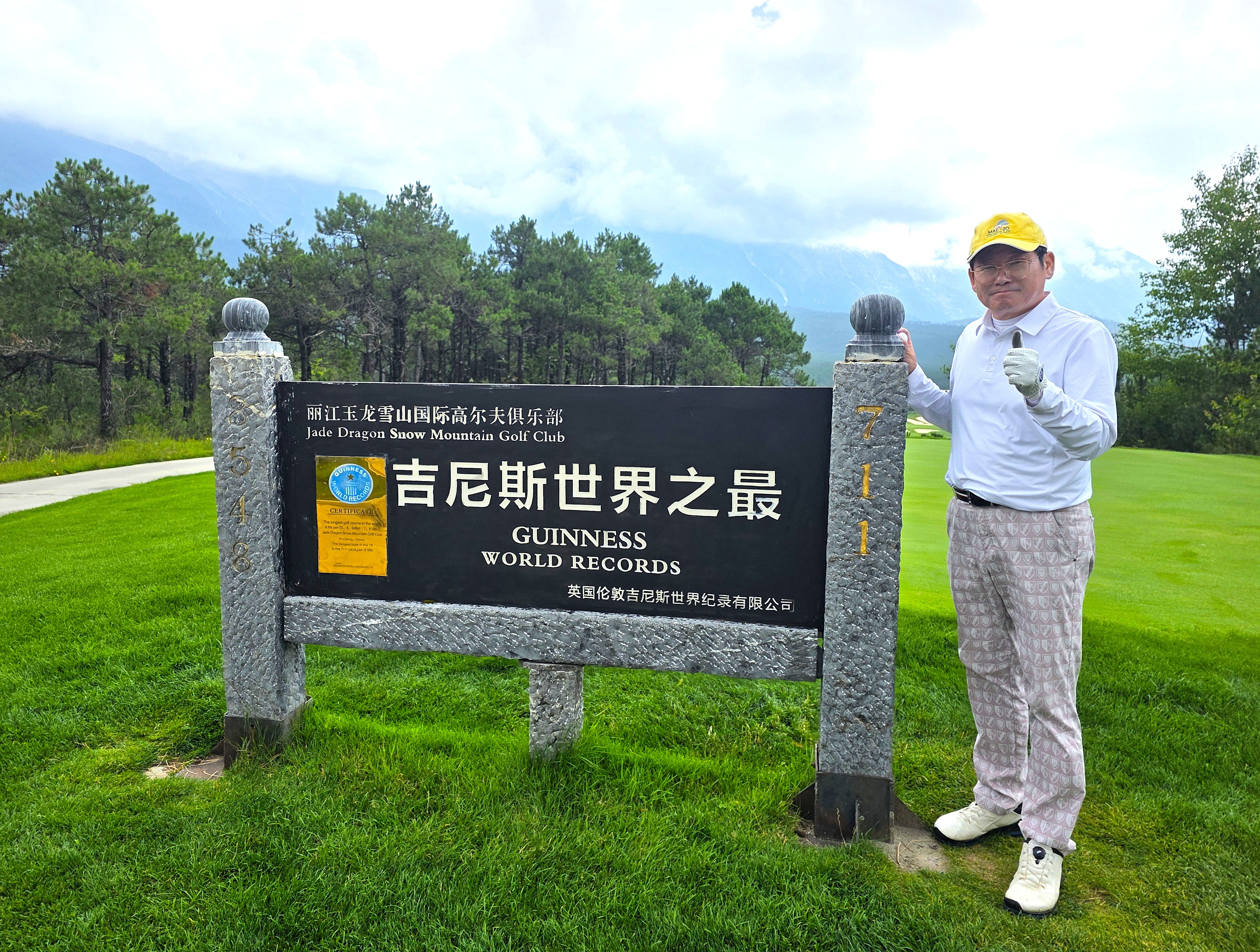 [사진설명] 해발 3,100m에 위치한 옥룡설산 골프장의 기네스 세계기록 인증 표지판 앞에서 포즈를 취했다. 세계에서 가장 높은 골프장에서 라운드한 특별한 순간을 담았다. 2025년 7월 17일 촬영