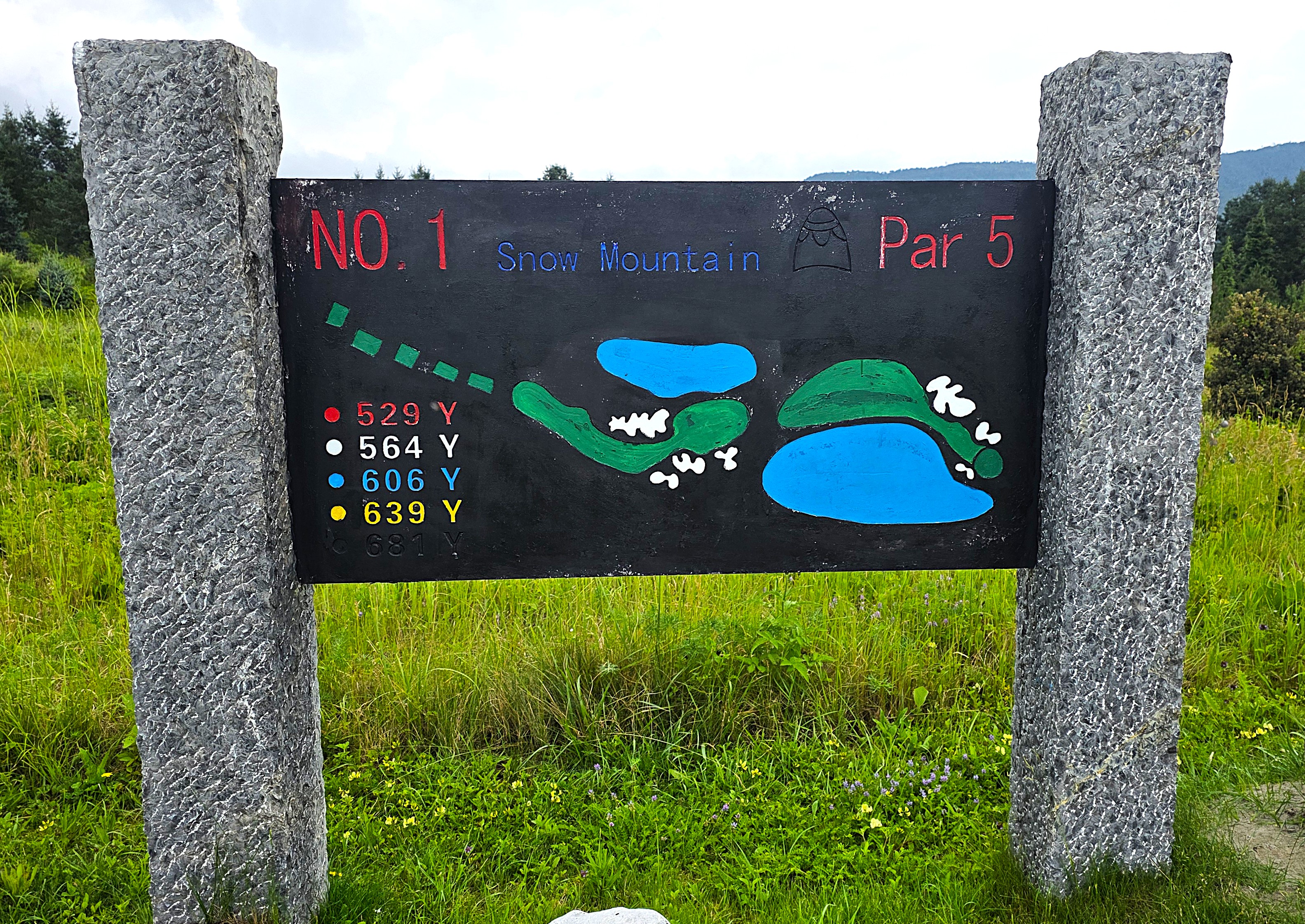 [사진설명] 매 홀마다 해당 홀의 레이아웃과 거리를 표시해둔 홀 맵. 홀의 특성을 잘 반영한 홀 이름이 영어와 나시족의 동파문자로 새겨져 있다. 1번홀의 이름은 <설산 Snow Mountain> 이다. 티 박스에 오르면 정면에 어마어마한 풍광을 만난다. 옥룡설산이다.