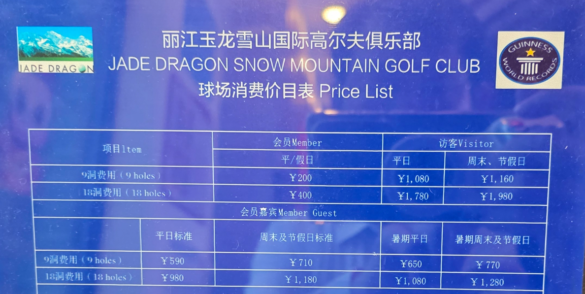 평일 그린파가 1.790위안 우리돈으로 약 36만원. 주말과 공휴일은 1.980위안 약 40만원으로 상당히 높다. 이 비용에는 우리와 달리 전동카터(2인1승)와 캐디(2백1캐디)가 포함되어 있다. 비싼 듯 해도 충분하 그만한 가치가 있다.