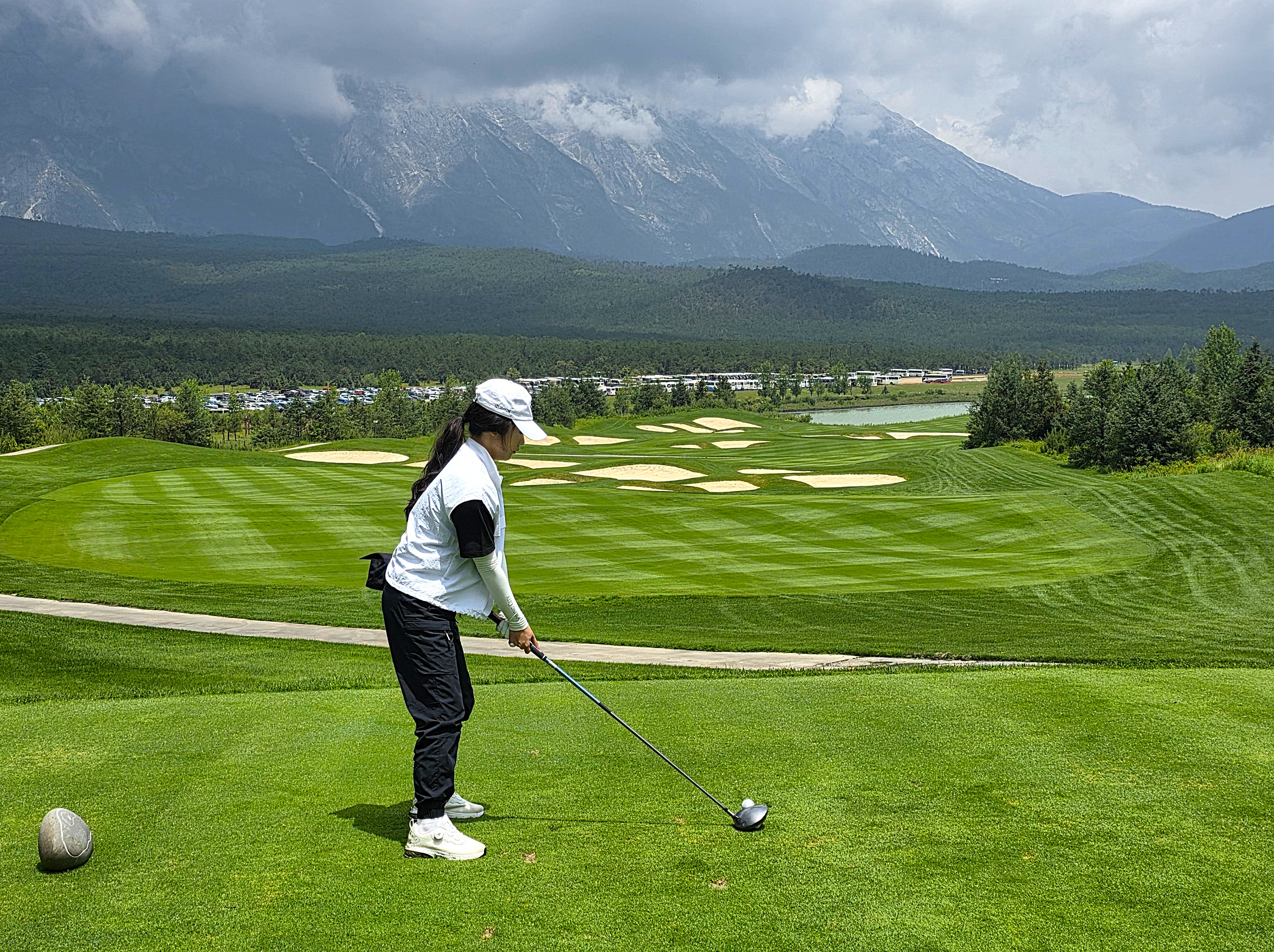[사진설명] 옥룡설산 골프장의 아름다운 코스를 배경으로 동반자인 여성 골퍼가 티샷을 준비하는 순간이다. 해발 3,100m의 고산 지대에서 펼쳐지는 라운드는 비거리와 풍경 모두에서 특별함을 선사한다.