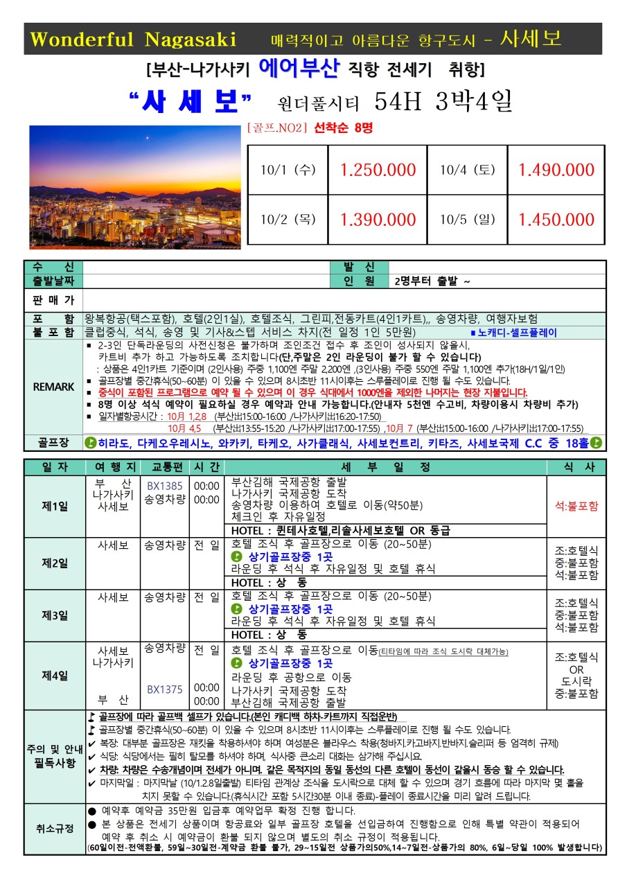 🔽 사세보 원더풀 시티 54H 🔹이용골프장: 히라도CC, 키타즈CC, 사세보CC, 사세보국제CC, 사가클래식CC, 다케오우레시노, 와카키CC.다케오CC ( 바로가기)