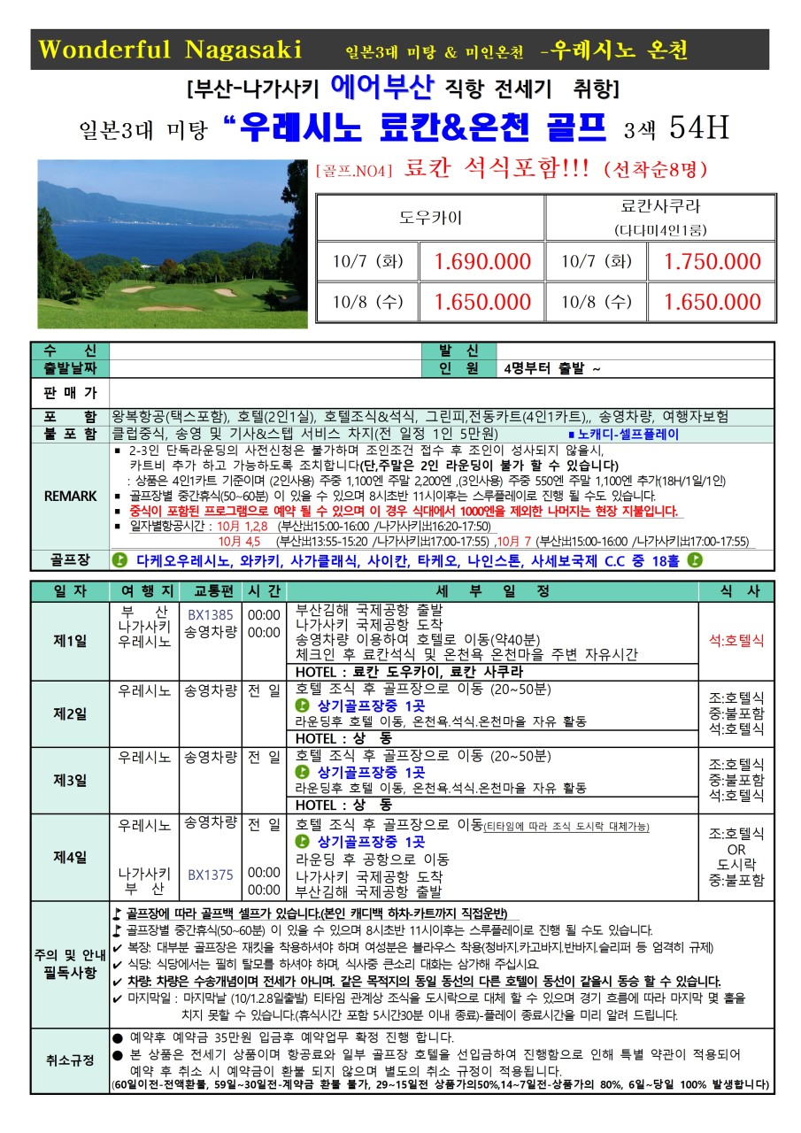 🔽일본3대 미탕“우레시노료칸&온천 골프 3색 🔹이용골프장: 다케오우레시노,타케오, 사가클래식, 와카키, 나인스톤CC,사세보국제 C.C (바로가기)