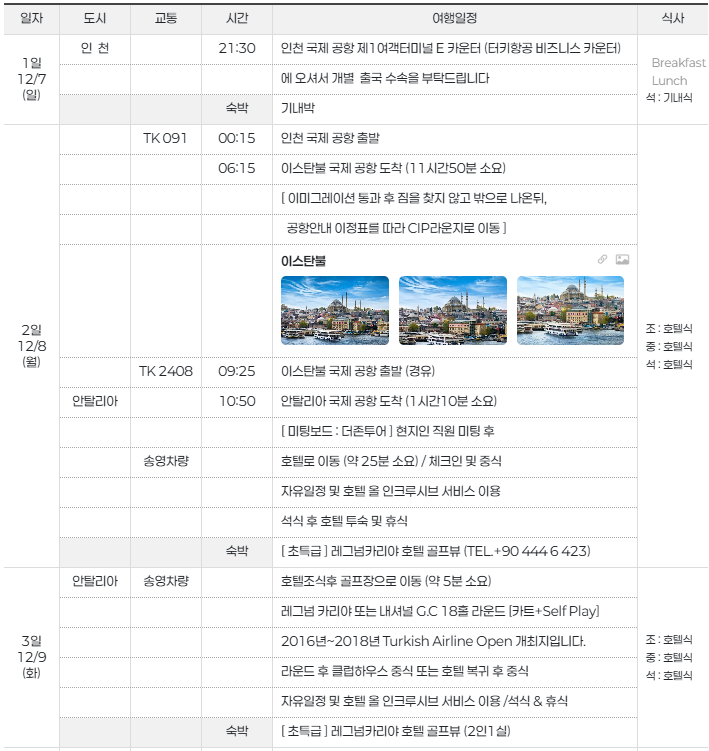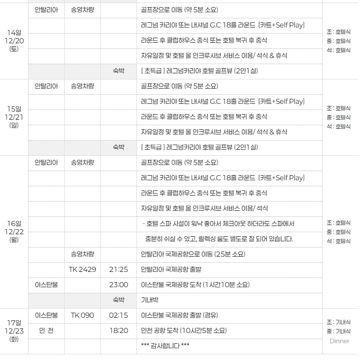 여행은 인천공항 출발로 시작되며, 이스탄불 경유 후 안탈리아에 도착합니다. 이후 레그넘 카리야 호텔에서 14박을 머물며 매일 골프 라운드와 호텔의 올 인클루시브 서비스를 즐기게 됩니다. 마지막 날에는 체크아웃 후 스파 시설을 이용하며 휴식을 취한 뒤 귀국합니다. ( 아래 일정표는 12월 7일~23일 샘플 참고용 입니다 )