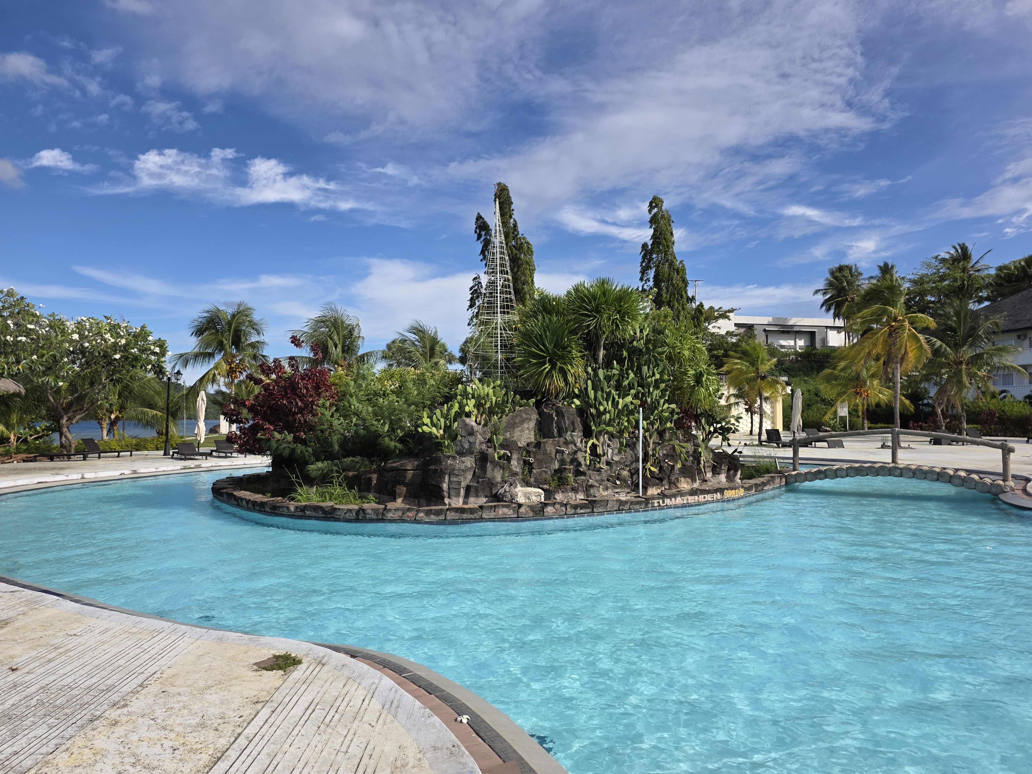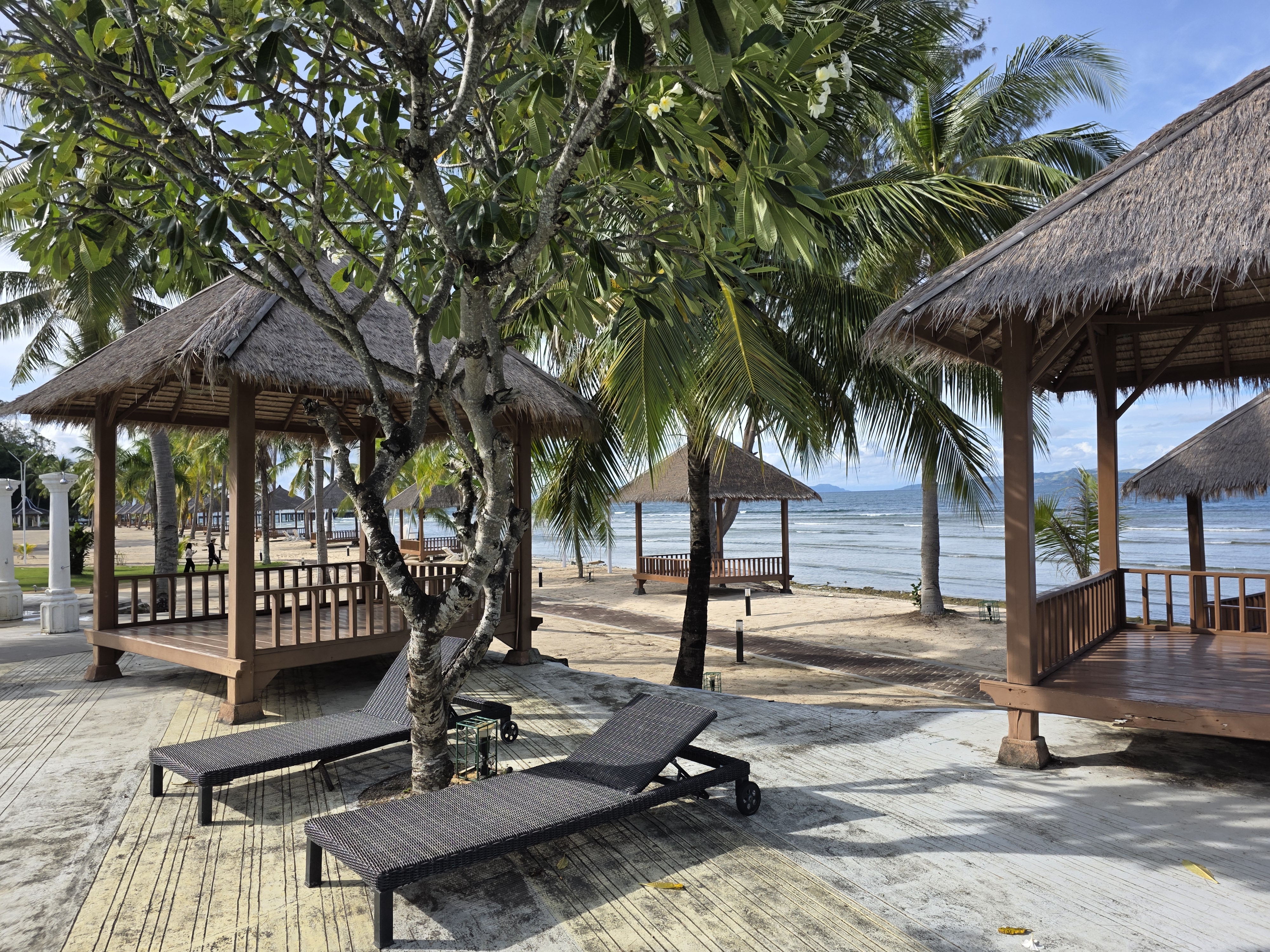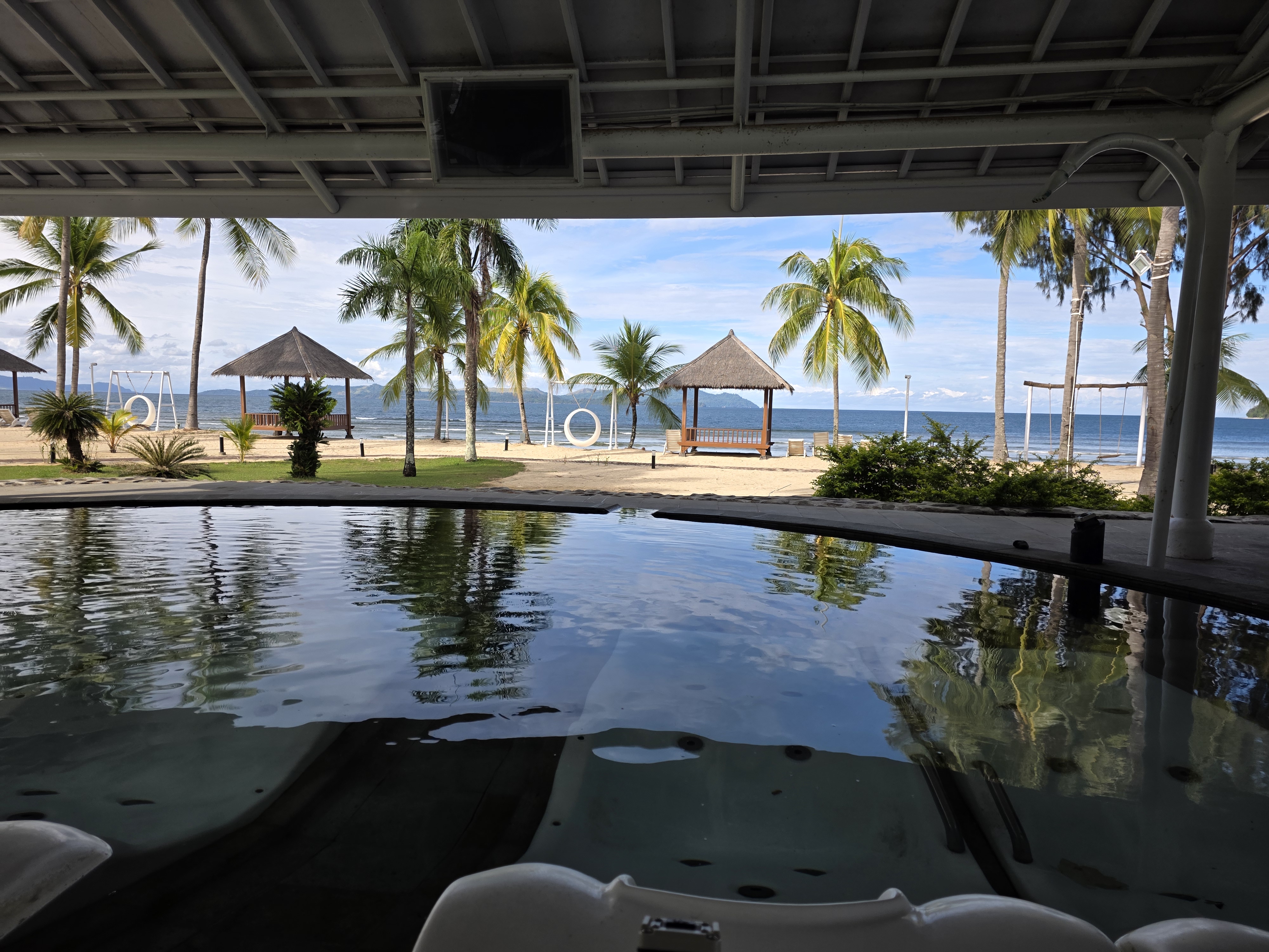 마나도는 활화산 지역이라 온천이 풍부하다. 파라다이스 리조트 앞에도 해수온천이 분출해, 원수를 그대로 이용한 야외탕이 있다. 정면으로 바다가 펼쳐지고, 야자수 사이로 방갈로가 늘어서 있다. 바람에 흔들리는 야자수를 보며 ‘가족들과 함께 왔더라면’ 하는 생각이 스쳤다. 골프를 치지 않아도 충분히 즐길 수 있는 곳이다.