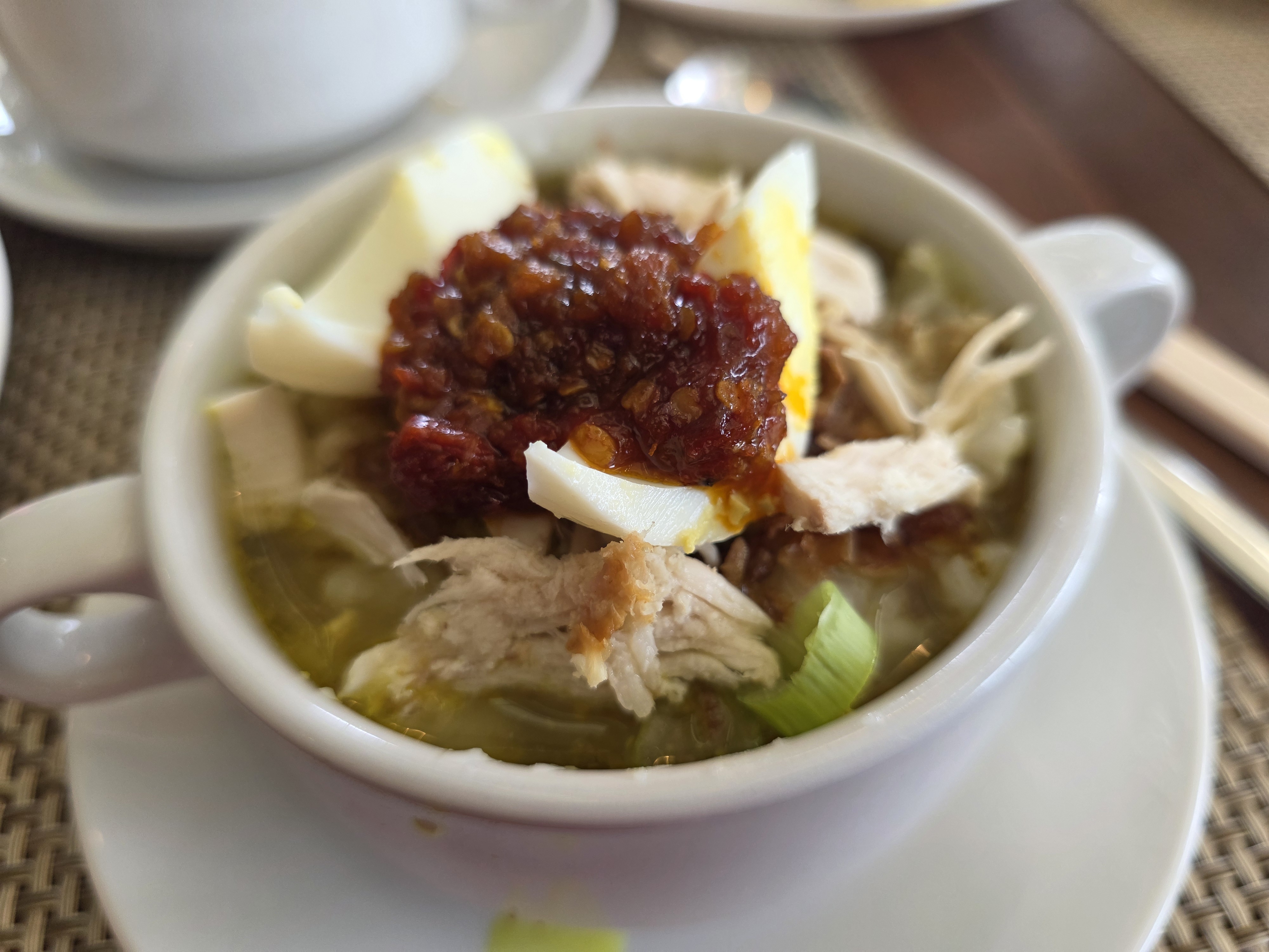 조식 뷔페에는 다양한 음식이 준비돼 있었지만, 낯선 현지식 보다는 한식 코너로 손이 갔다. 아내가 이것저것 담아온 접시에는 색다른 음식이 가득했다. 보기보다 맛이 좋아 놀랐다. 이곳의 한국인 회장님이 직접 식당에 내려와 인도네시아식 닭죽을 준비해 주었는데, 쌀 국수가 없다고 아쉬워 하다 그 죽을 두 그릇이나 비웠다. 시래기국도 연달아 두 그릇. 한국식 국그릇이 아닌 스프 볼 크기라며 스스로를 변명했다.