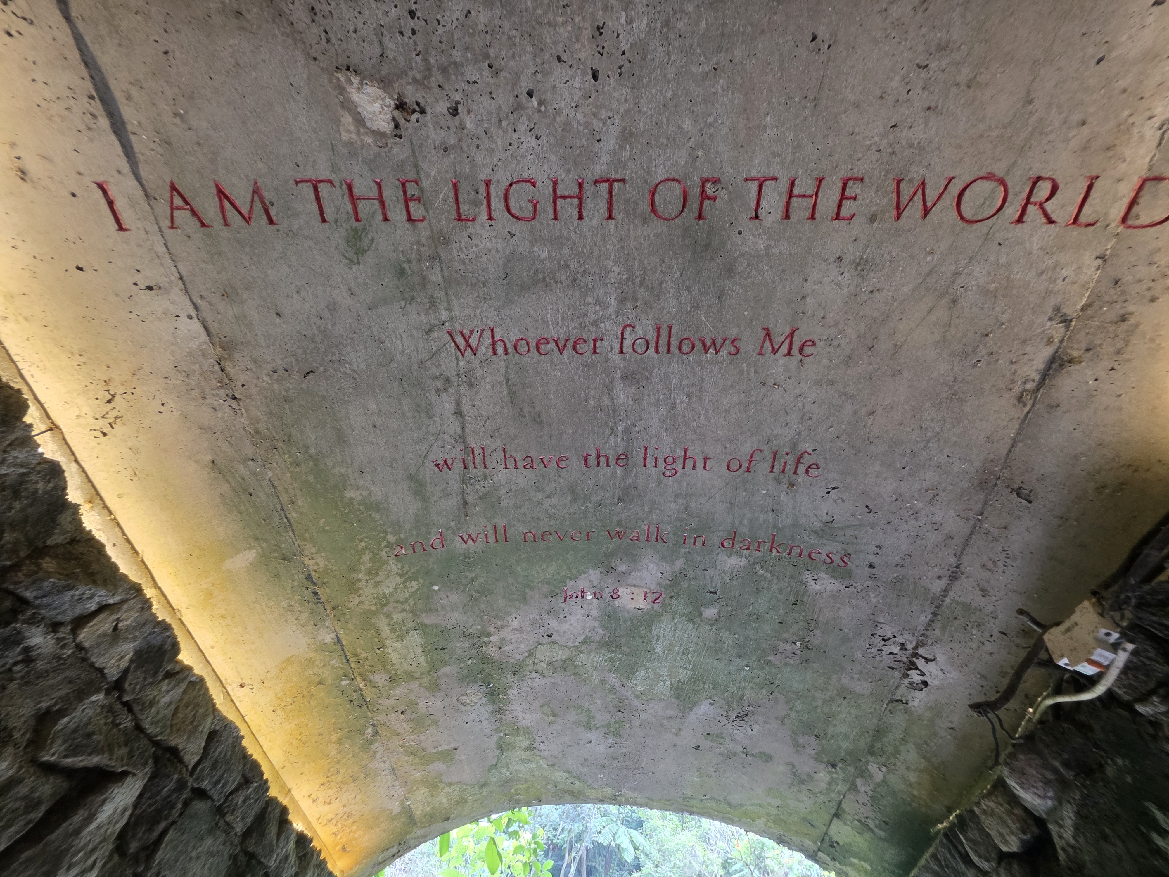 예수님의 무덤에서 나오는 회랑의 천정에 븕은 글씨로 요한복음의 성경 귀절이 영어로 새겨져 있다.