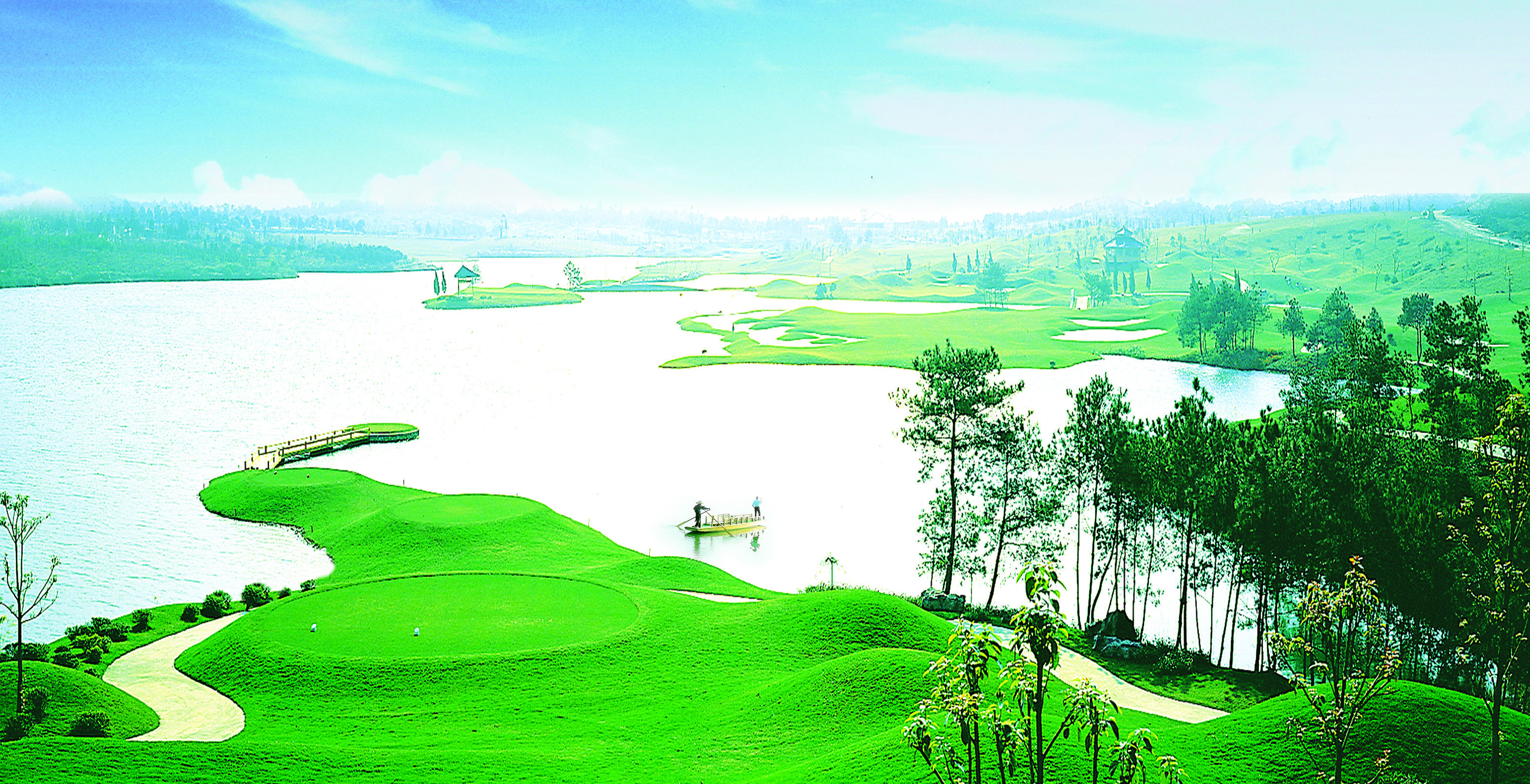 첫 홀 티박스에 서니, 문득 당나라 대문장가 한유의 시 한 줄이 귓가에 맴도는 것 같았다. ‘강물은 푸른 비단띠 같고, 산은 옥비녀처럼 푸르다.’ 한유는 실제로 계림을 밟아보진 못했지만, 상상만으로도 이 풍경의 본질을 꿰뚫었다. 페어웨이를 따라 이어지는 호수의 물길은, 정말 누군가의 허리를 감싼 비단띠처럼 부드럽고 우아하다.