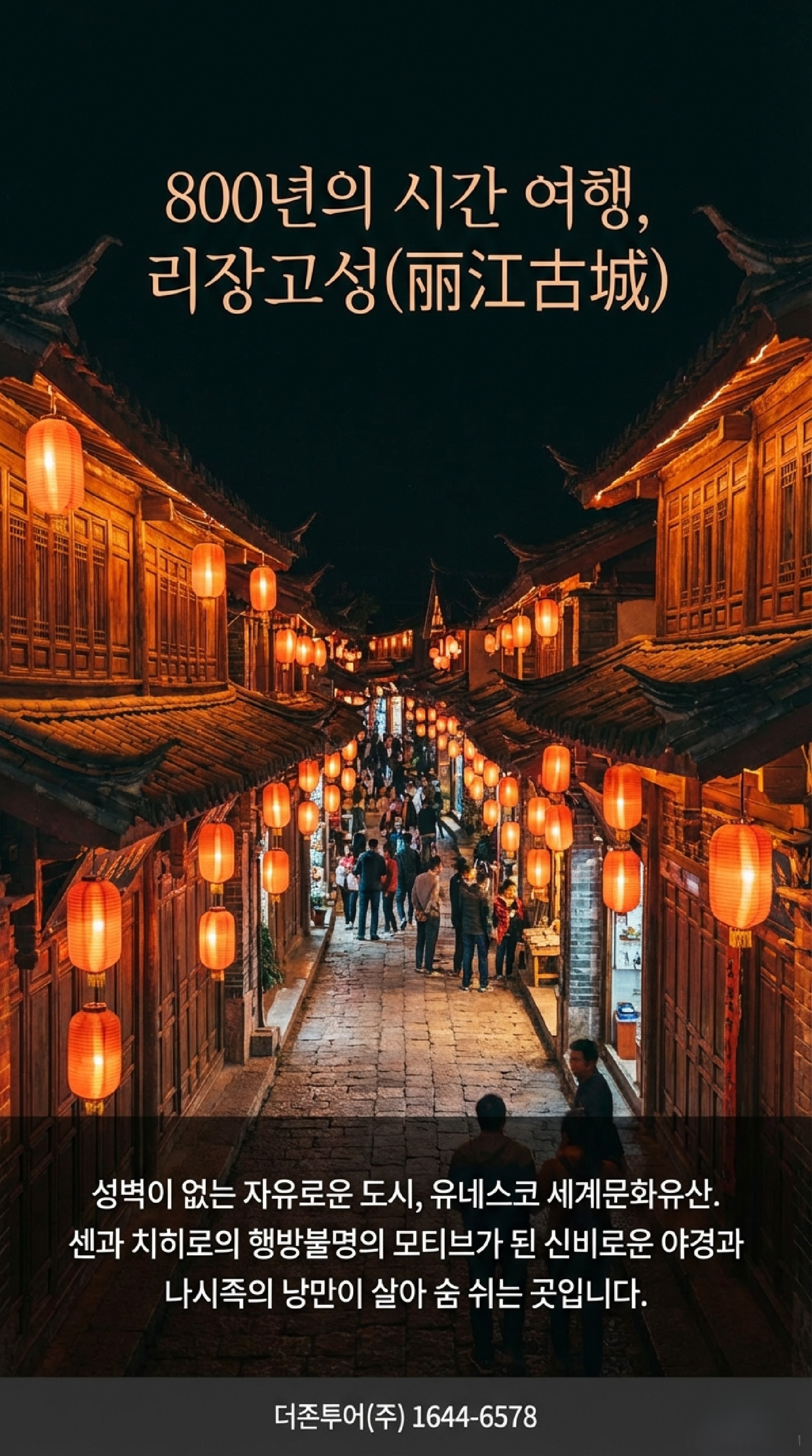 유네스코 세계문화유산인 리장 고성(다옌 고성)은 낮보다 밤이 아름답다. 800년 전 송나라 시대의 모습을 고스란히 간직한 이곳은, 미야자키 하야오의 애니메이션〈센과 치히로의 행방불명〉의 모티프가 되었다고 전해진다. 실제로 밤의 고성은 현실과 환상의 경계가 흐릿해진다.