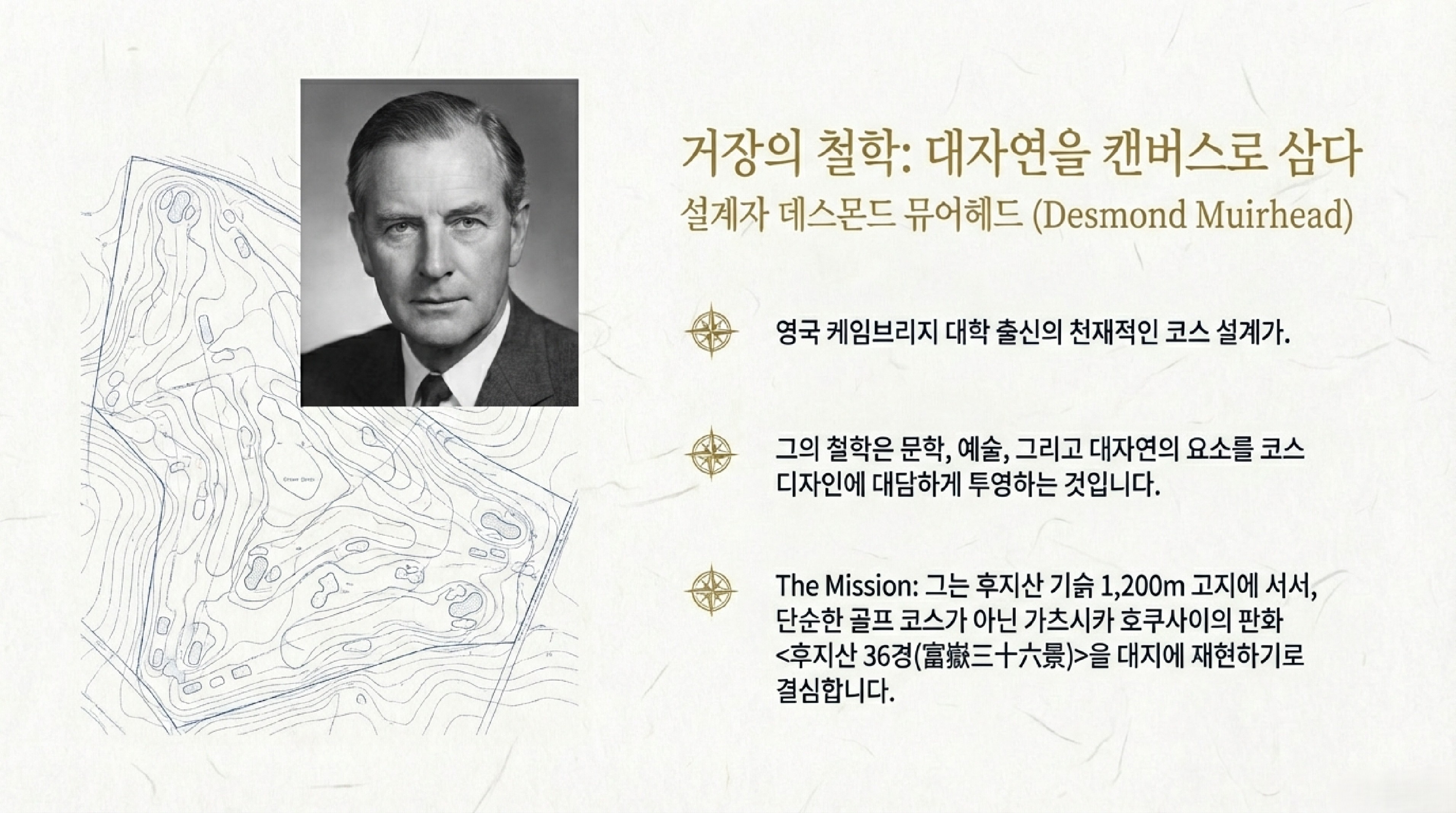 세계적인 코스 설계가 데스몬드 뮤어헤드(Desmond Muirhead)는 문학, 예술, 대자연에서 영감을 얻어 코스를 디자인하는 것으로 유명하며, 후지 클래식에서는 호쿠사이의 판화 속에 담긴 예술적 요소를 각 홀의 조형과 전략에 반영했습니다,.