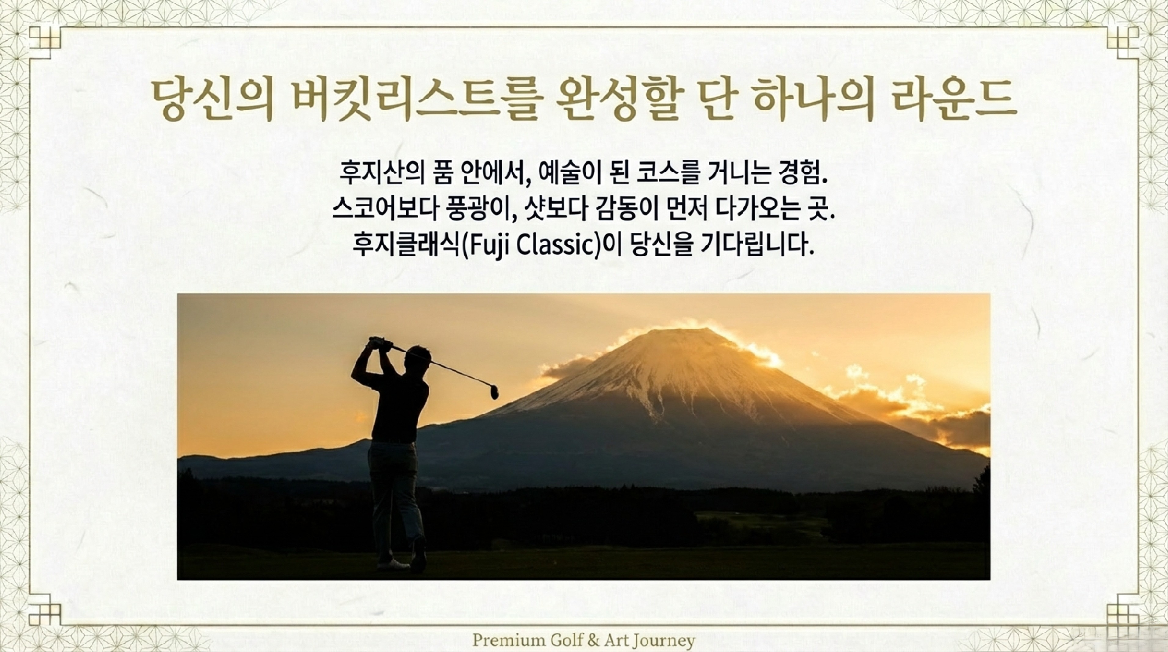 결론적으로 후지 클래식은 단순히 골프를 치는 공간을 넘어, 호쿠사이의 <후지산 36경>이라는 예술 작품 안에서 플레이어가 직접 그 풍경의 일부가 되어 라운드를 즐길 수 있도록 설계된 독창적인 코스입니다,