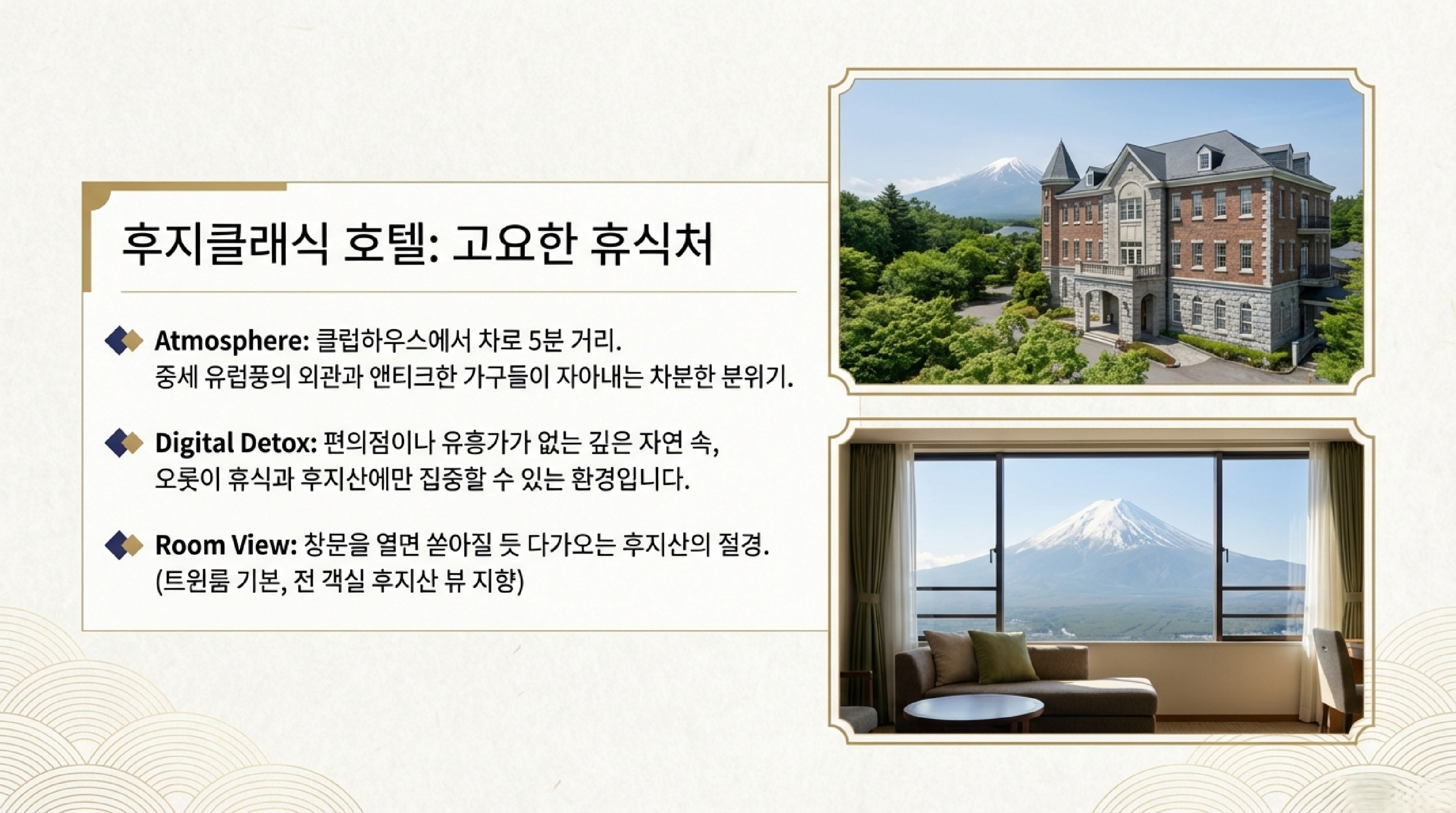 후지 클래식 호텔은 단순한 잠자리가 아니라 <후지산 뷰 노천탕과 프랑스 요리>를 통해 골프 여행의 품격을 높여주는 힐링 공간입니다.