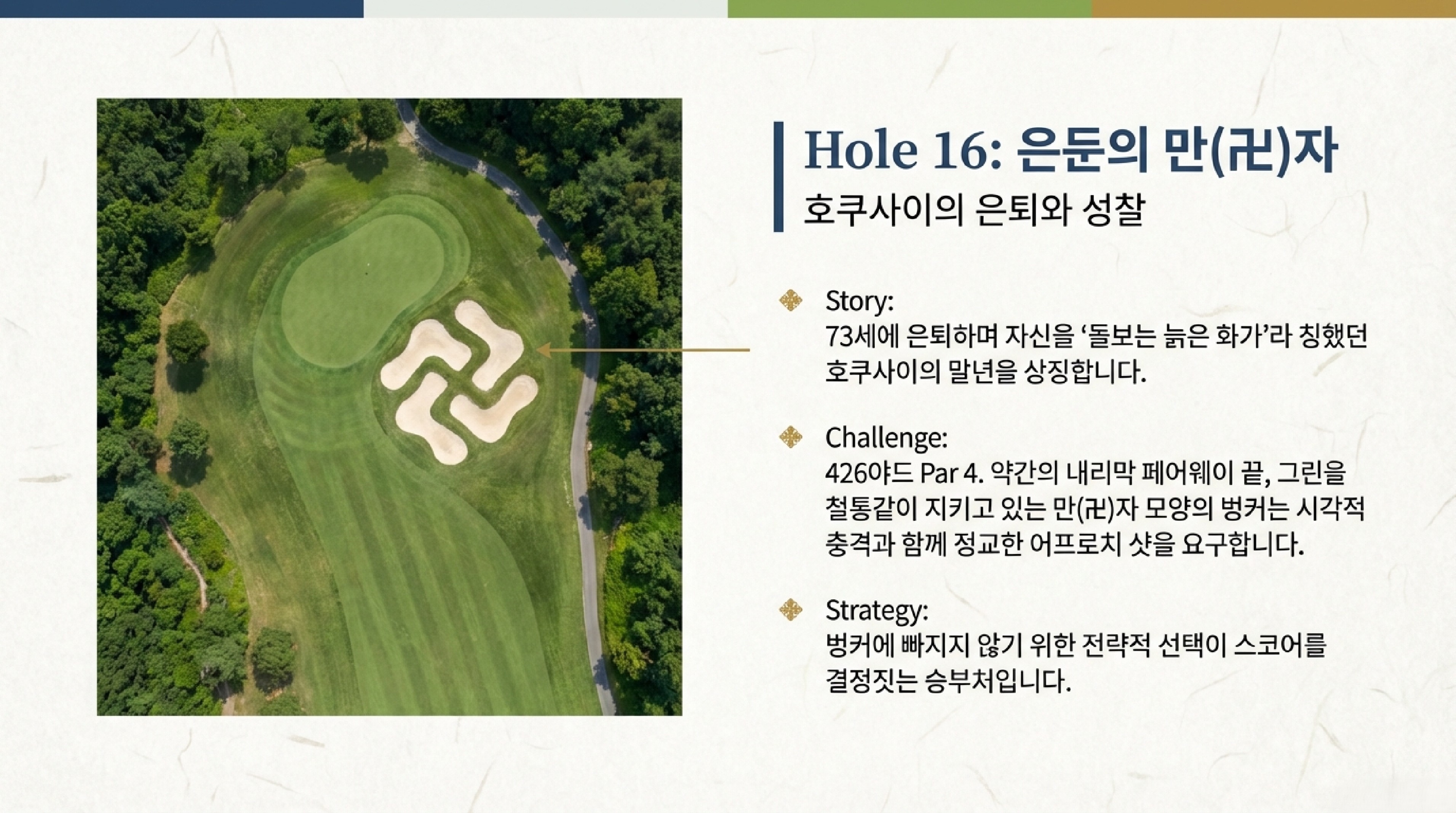 • 16번 홀 (Par 4) - 호쿠사이의 만(卍)자 인장: 이 홀은 호쿠사이의 은둔 시대를 상징합니다. 페어웨이에서 그린으로 이어지는 길목에 만(卍)자 모양의 벙커가 배치되어 있는데, 이는 호쿠사이가 말년에 자신을 '돌보는 늙은 화가'라 칭하며 사용했던 인장을 코스 디자인에 직접적으로 반영한 것입니다