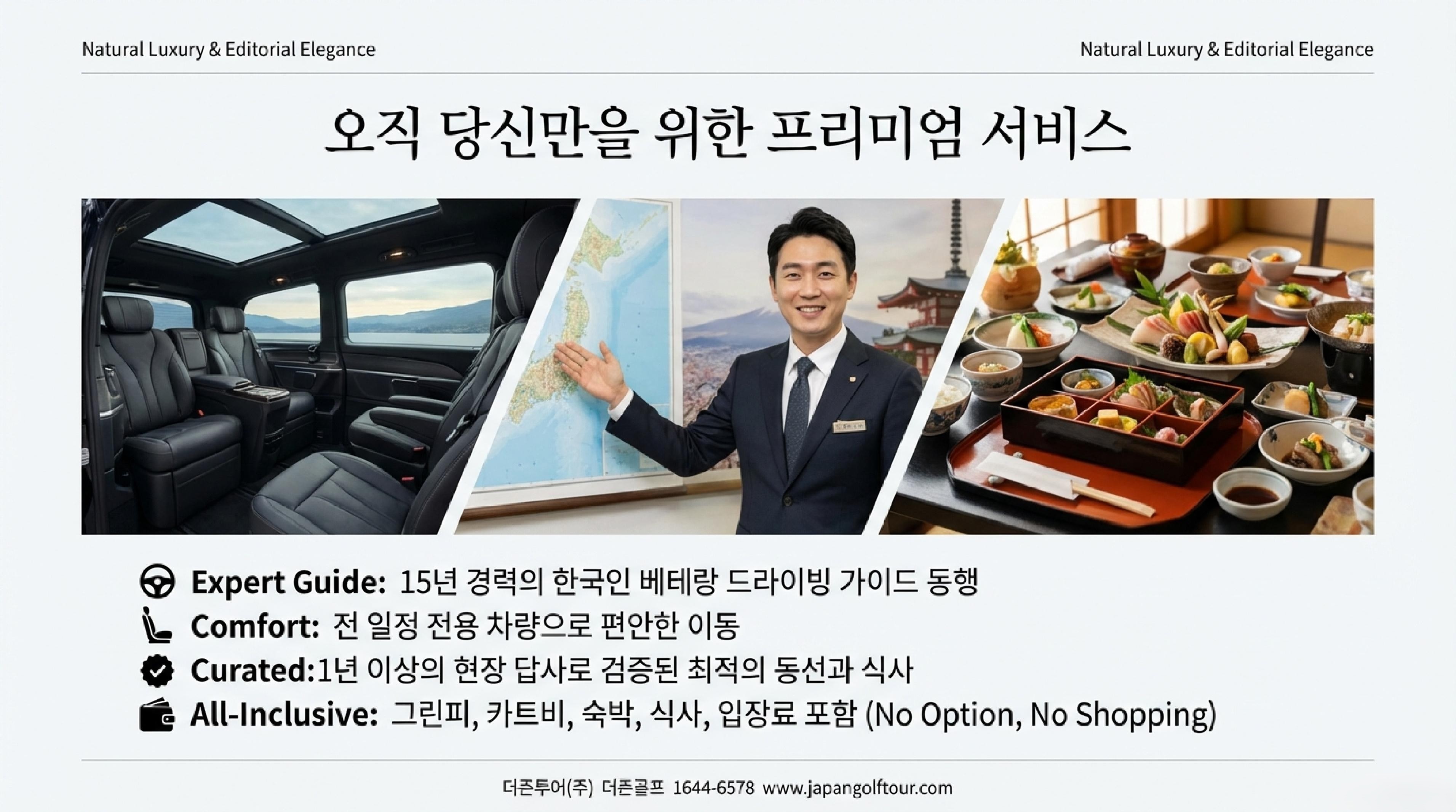 시코쿠의 4개 현을 일주하며 골프와 예술, 그리고 휴식으로 가득 채웠던 6박 7일의 여정을 마무리합니다. 15년 경력의 베테랑 한국인 가이드가 전 일정을 동행하며 여러분의 불편함을 꼼꼼히 살필 것입니다. 쇼핑이나 옵션에 대한 부담 없이, 오직 시코쿠의 자연과 예술, 그리고 골프에만 집중할 수 있는 진정한 프리미엄 서비스를 약속드립니다.