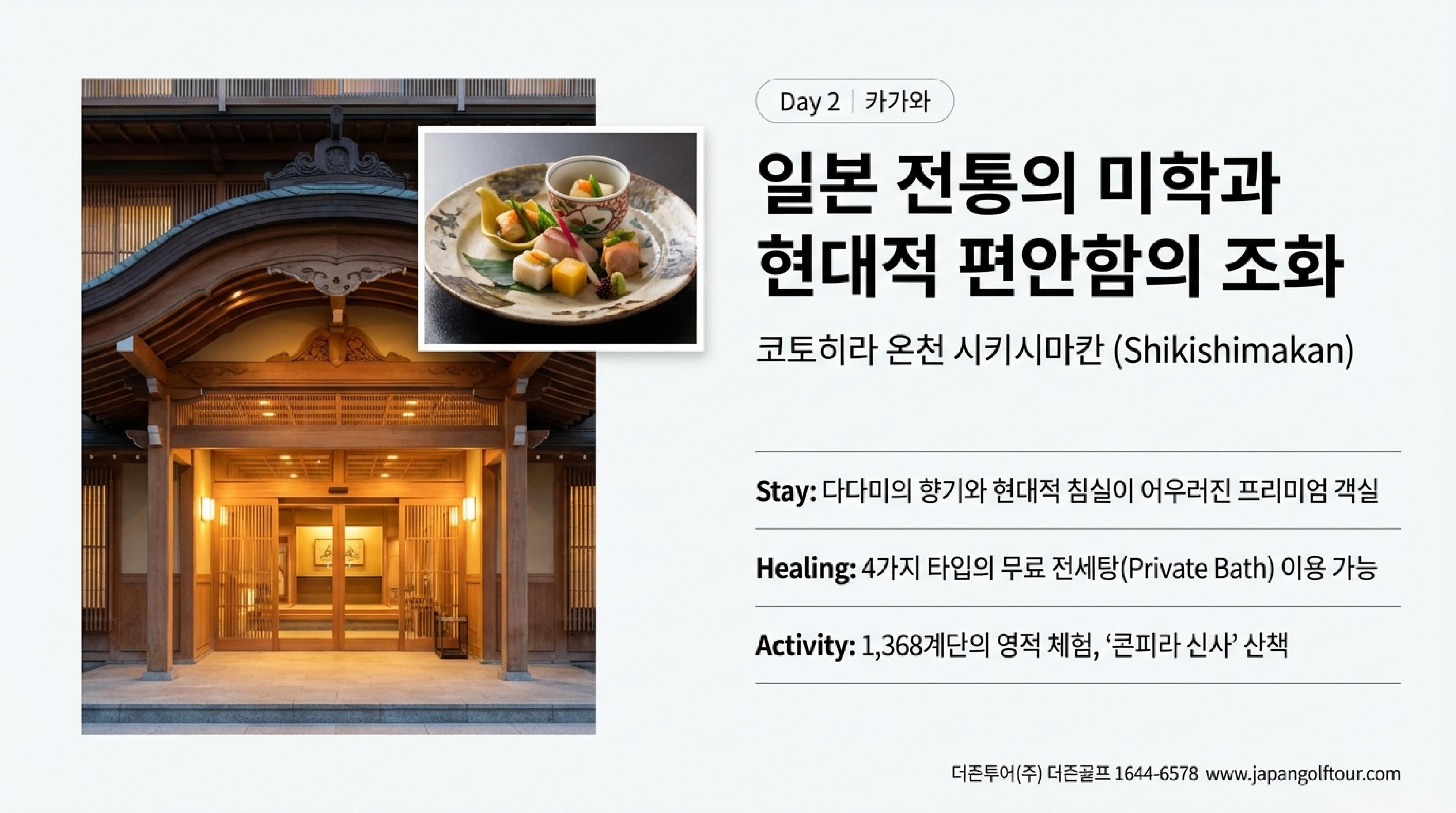라운드 후에는 1,368계단의 영적 체험으로 유명한 콘피라 신사 아래 자리한 시키시마칸 료칸으로 향합니다. 이곳은 일본 전통의 미학과 현대적 편안함이 조화를 이룬 프리미엄 숙소입니다. 다다미의 은은한 향기가 감도는 객실에서 휴식을 취하고, 4가지 타입의 무료 전세탕에서 프라이빗한 온천욕을 즐길 수 있습니다. 제철 식재료로 정성껏 차려낸 가이세키 석식은 잊지 못할 밤을 선사할 것입니다.