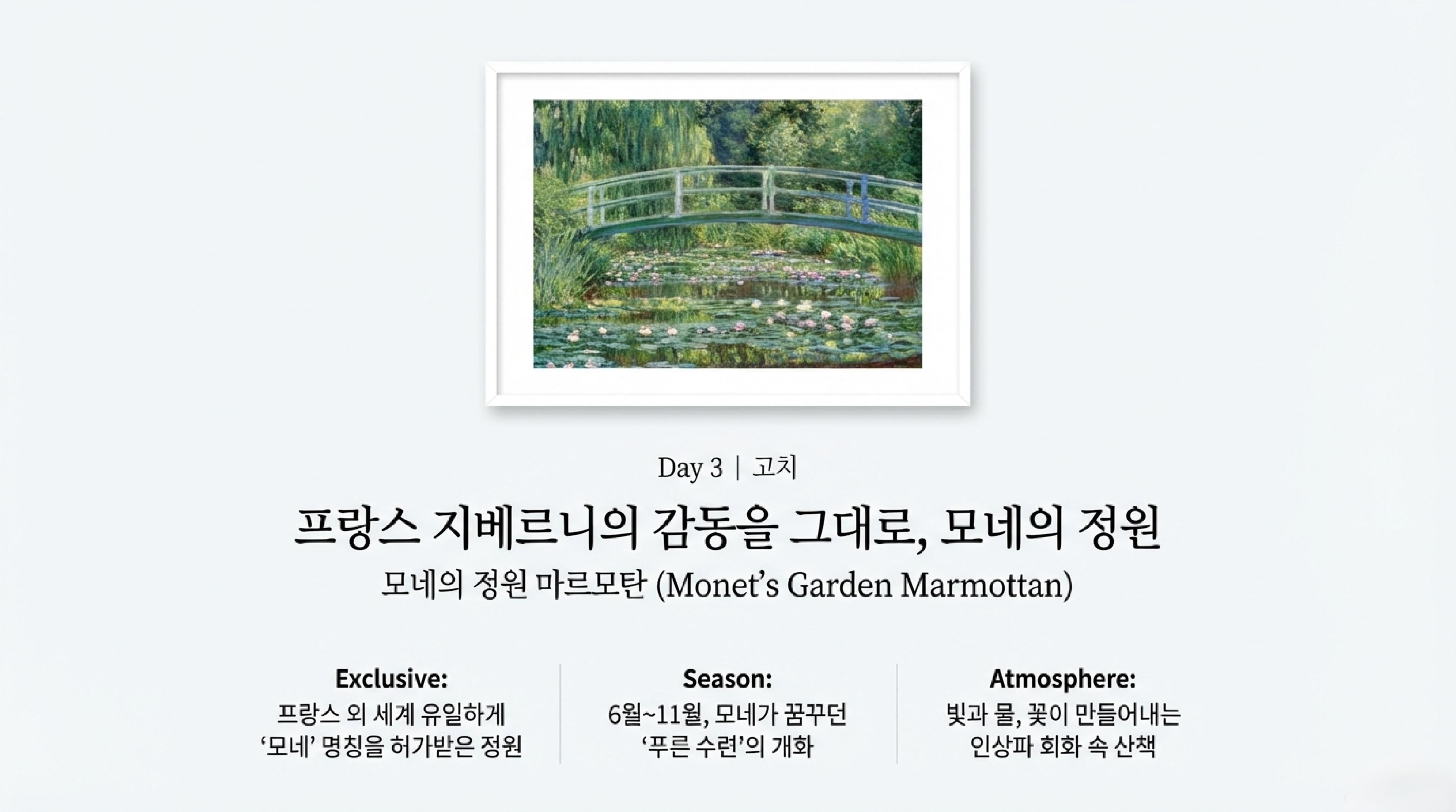 라운드후 오후에는 프랑스 외 지역으로는 세계에서 유일하게 '모네'라는 명칭 사용을 허가받은 모네의 정원 마르모탄을 방문합니다. 빛과 물, 그리고 형형색색의 꽃들이 만들어내는 풍경은 마치 클로드 모네의 회화 속으로 들어온 듯한 신비로운 감동을 줍니다.