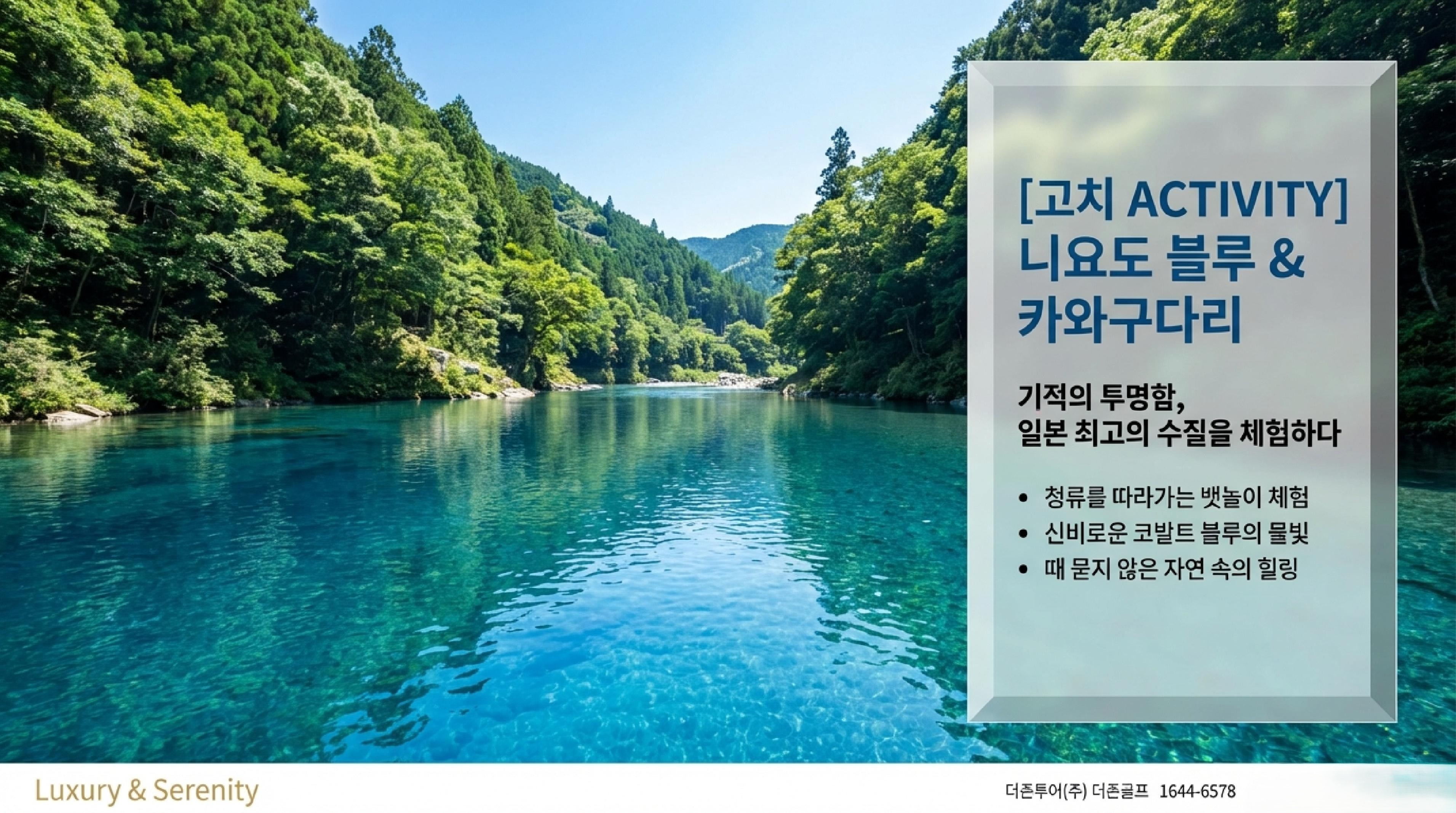다섯째 날은 대자연과 건축 예술이 만나는 가장 서정적인 날입니다. 신비로운 물빛으로 '기적의 물'이라 불리는 니요도강에서 '카와쿠다리(뱃놀이) 를 즐기며 투명한 '니요도 블루'를 가장 가까이에서 만나봅니다.