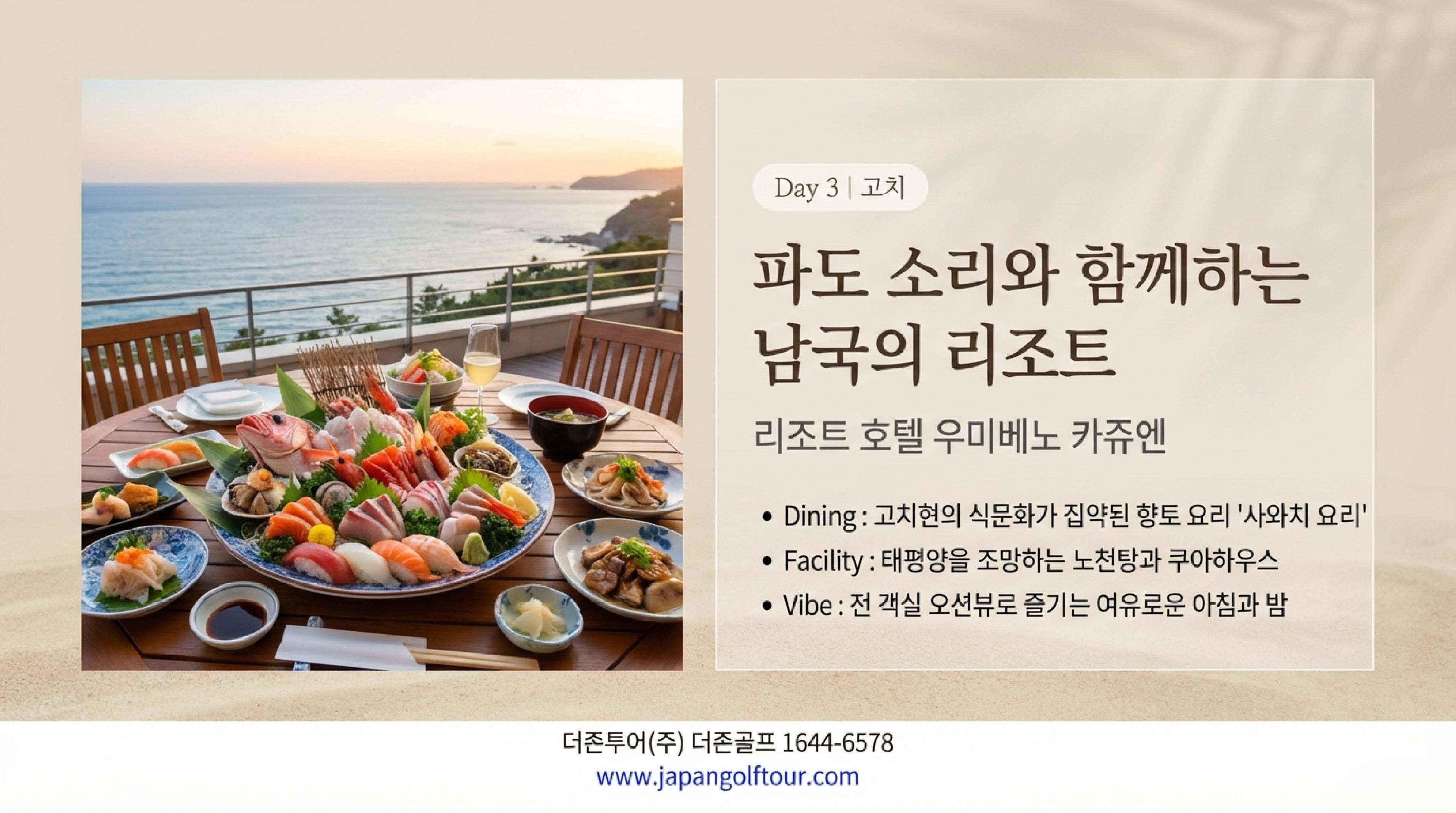 오늘의 안식처는 전 객실 오션뷰를 자랑하는 리조트 호텔 우미베노 카쥬엔입니다. 파도 소리를 자장가 삼아 휴식하고, 저녁에는 고치현 식문화의 정수인 향토 요리 '사와치 요리'를 즐기며 남국의 여유를 만끽해 보시기 바랍니다.