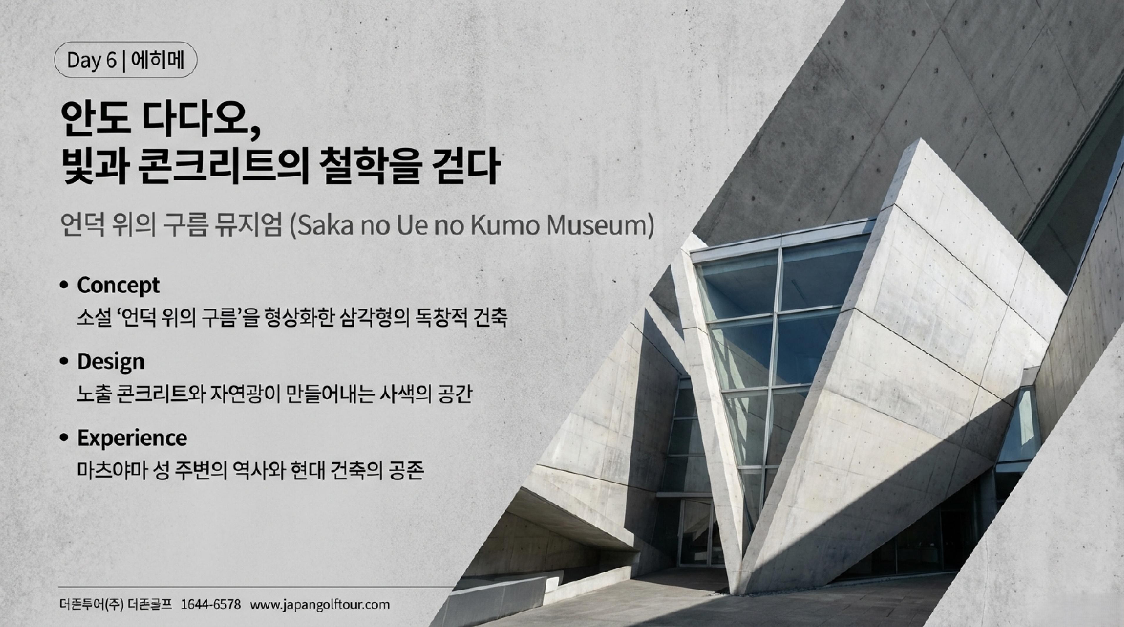 여섯째 날 아침, 노출 콘크리트와 자연광의 거장 안도 타다오가 설계한 언덕 위의 구름 뮤지엄을 방문합니다. 소설 '언덕 위의 구름'을 형상화한 삼각형의 독창적인 건축 구조와 그 안을 채우는 사색적인 공간은 여행자들에게 깊은 여운을 남깁니다.